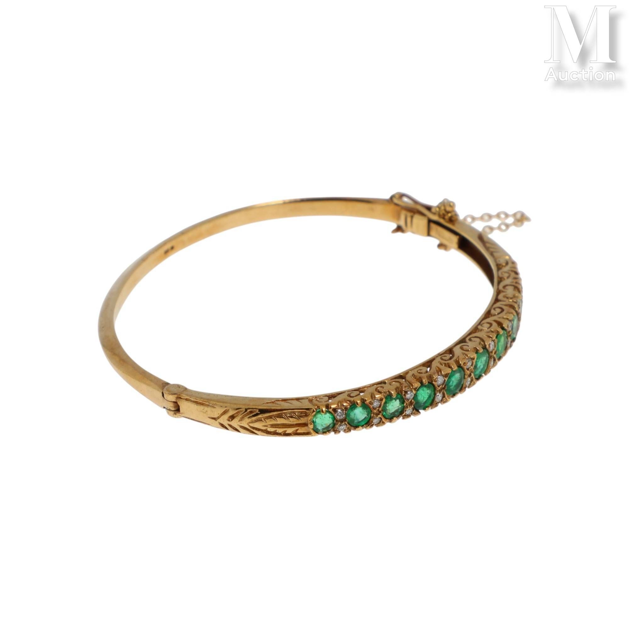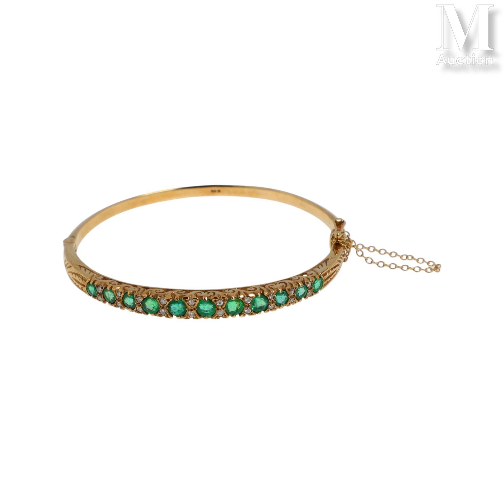 Bracelet in 9K (375°/°°) yellow gold alloy set with a line of emeralds alternating with small diamonds; the gallery is decorated with volutes, side opening with a ratchet blade with a safety eight and a safety chain.