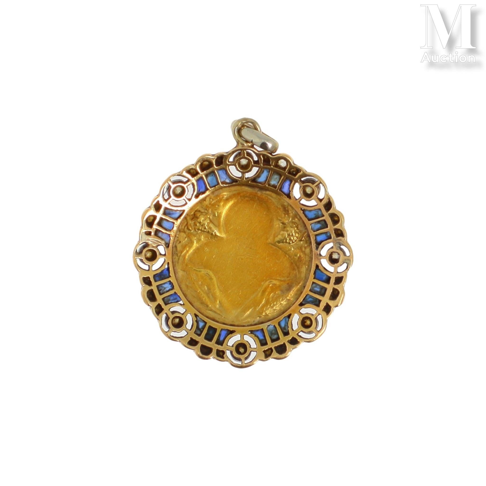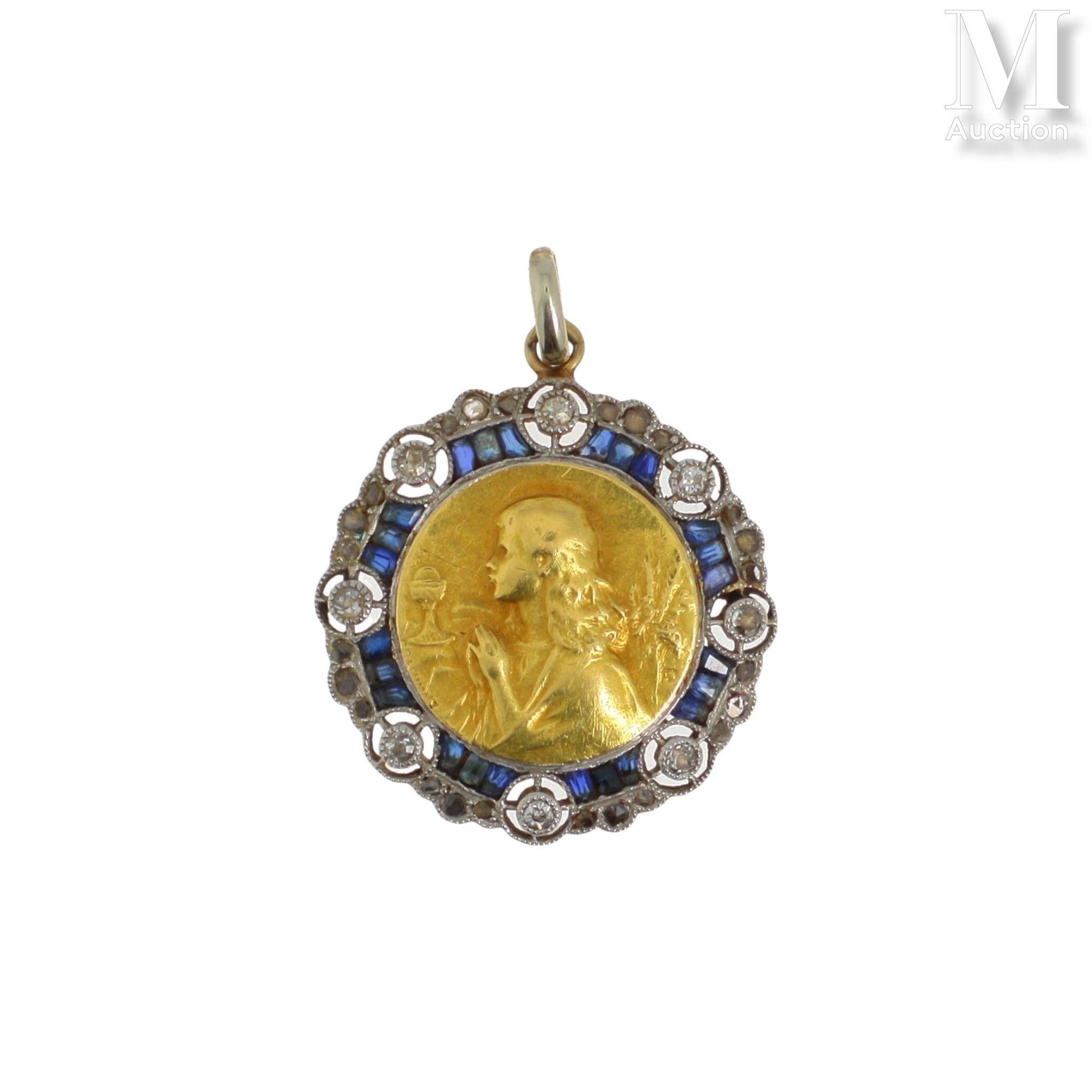 Circular medal in 18K (750°/°°) yellow gold and platinum (950°/°°) featuring a religious motif surrounded by calibrated sapphires and small diamonds.