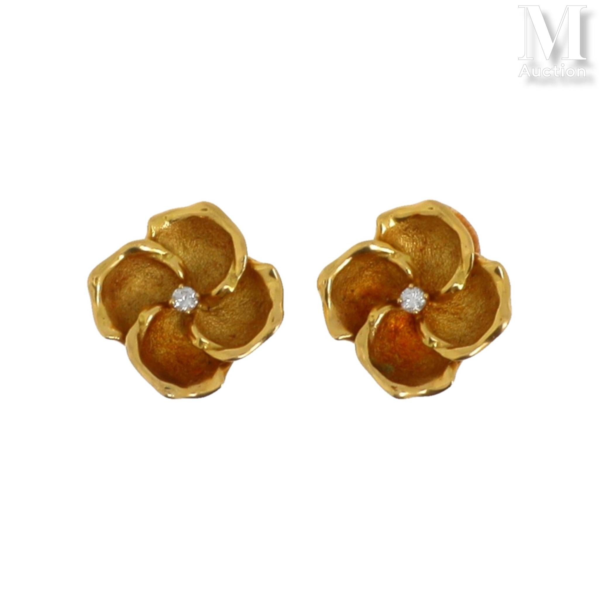 Pair of ear clips in 18K (750°/°°) yellow gold stylising flowers in textured gold, the pistil adorned with a brilliant-cut diamond.