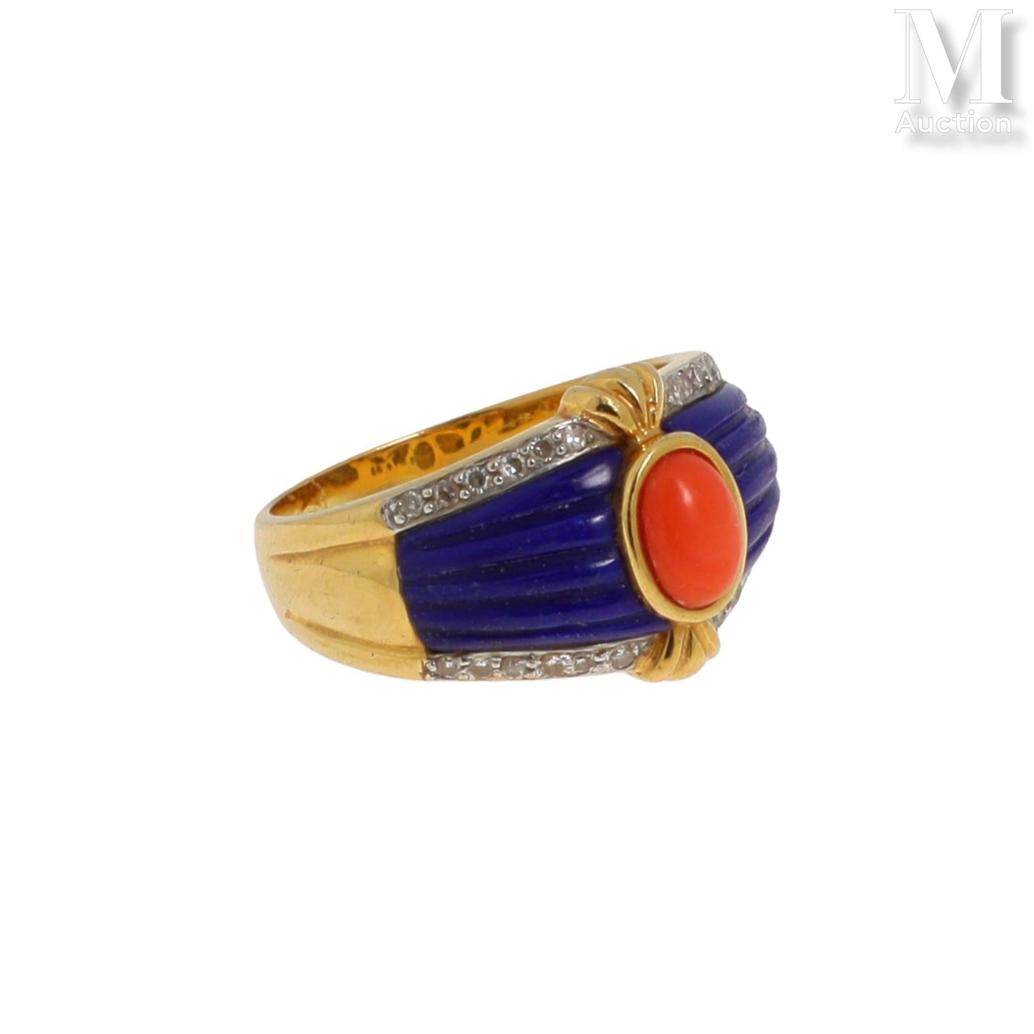 Ring in 18K (750°/°°) yellow gold centred on a cabochon of coral in a closed setting, set with gadrooned lapis lazuli and lines of claw-set diamonds.