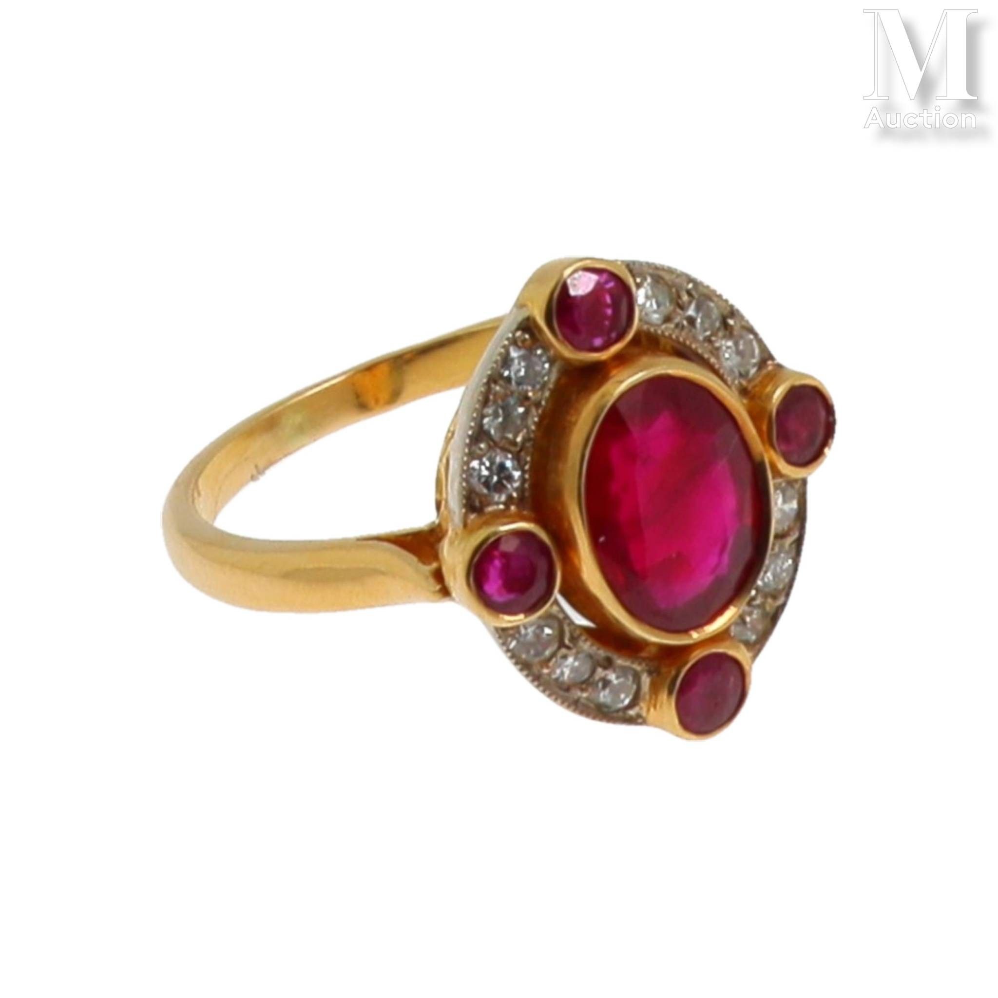 18K (750°/°°) yellow gold ring centred on a 2.14 ct oval Burmese ruby in a closed setting, set with diamonds and four small rubies.