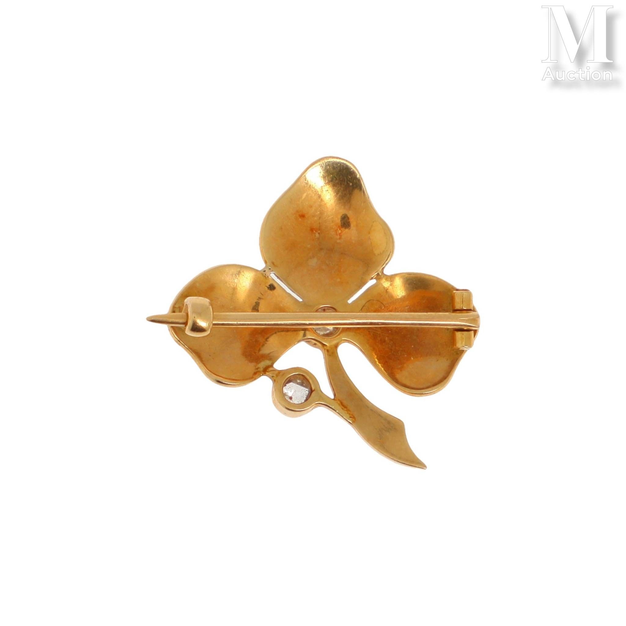 Brooch in 18K (750°/°°) yellow gold depicting a three-leaf clover set with two small rose-cut diamonds in a closed setting.