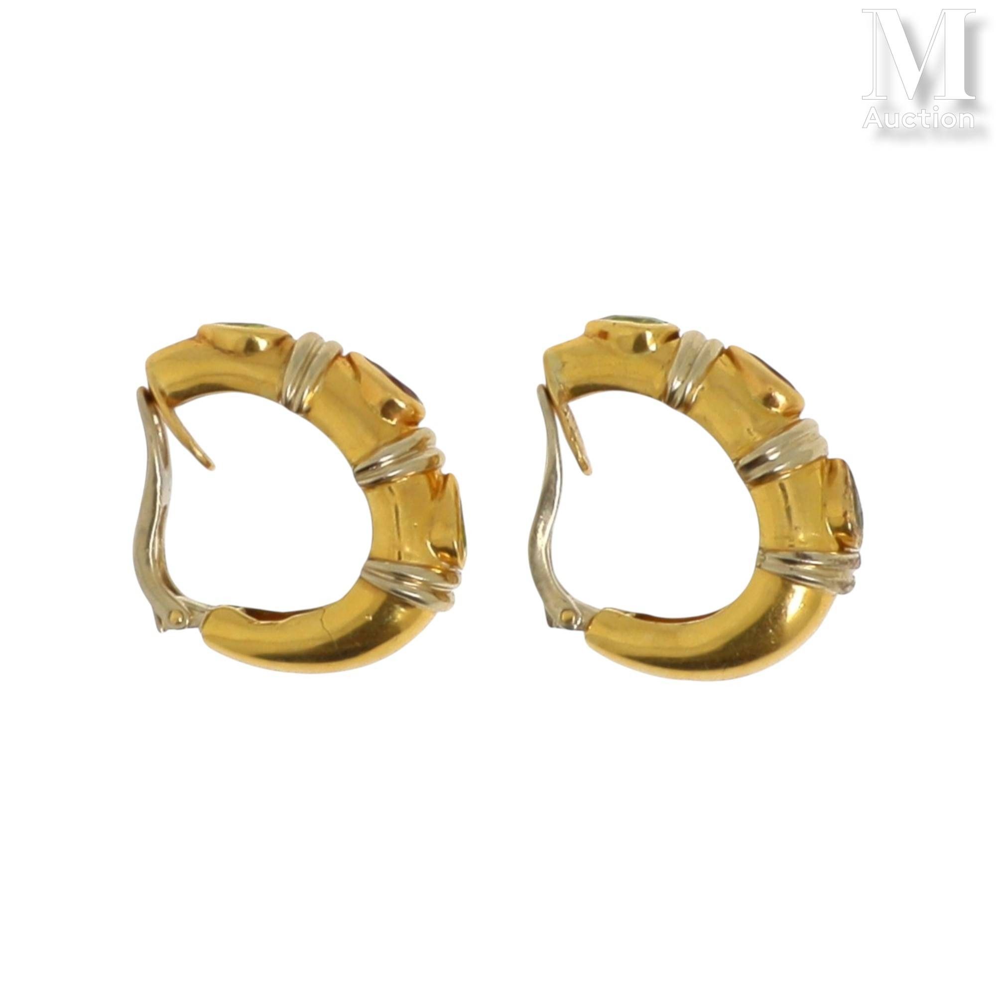 Pair of ear clips in 18K (750°/°°) yellow gold, each set with three gemstones.