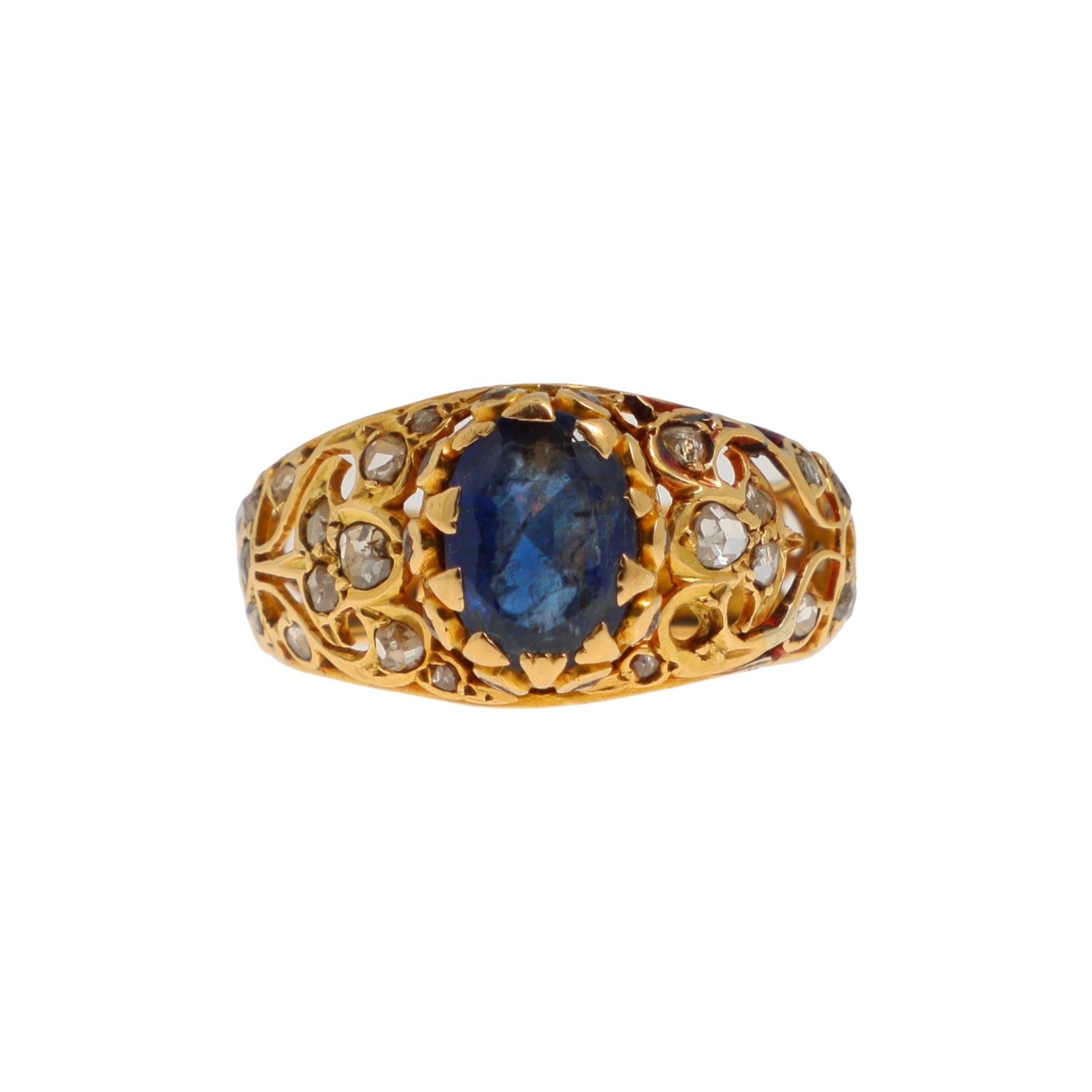 Ring in 18K (750°/°°) yellow gold centred on an oval sapphire set on claws, the openwork setting forming volutes adorned with small diamond chips.