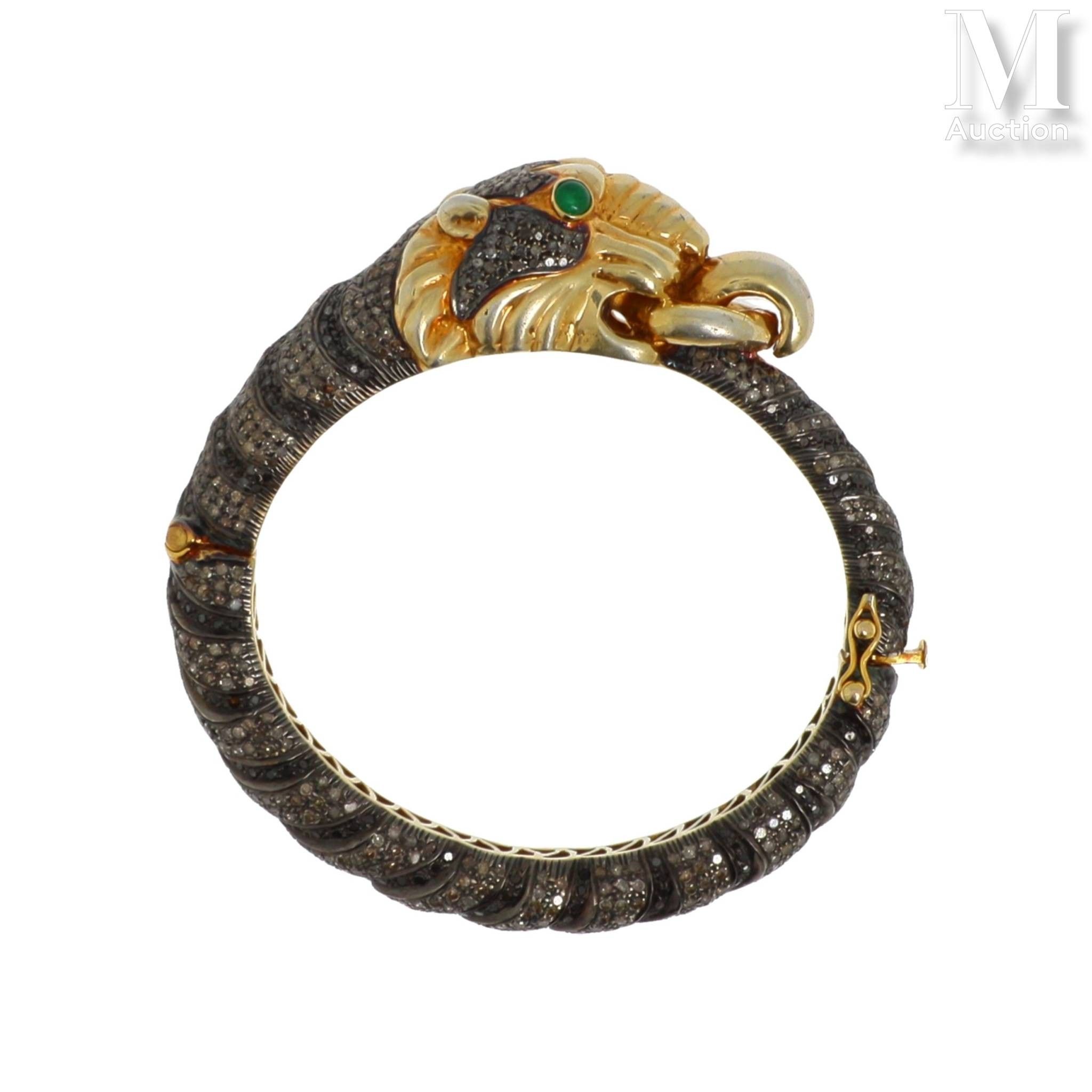 Rigid bracelet in 18K (750°/°°) yellow gold and silver (800°/°°) stylised as a tiger, the body adorned with small diamonds and the eyes set with two cabochon emeralds; side opening with ratchet blade and two safety eights.