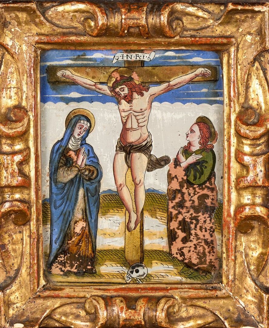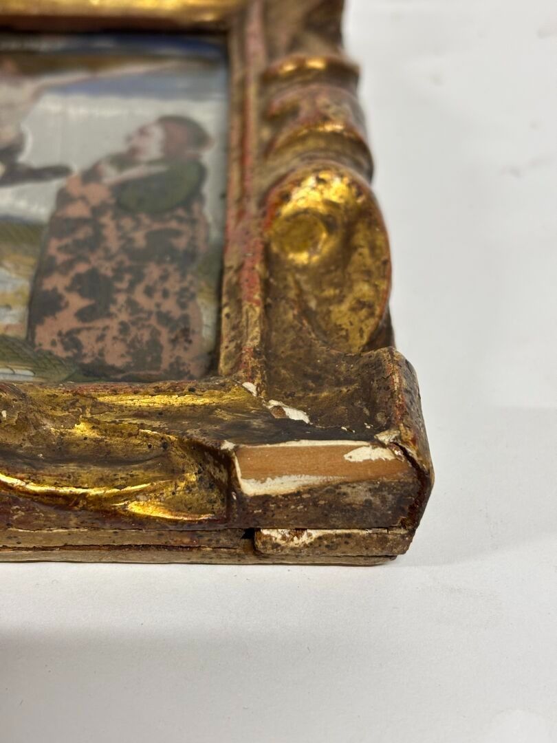 Carved and gilded frame known as Sansovino Framing a glass painting from the same period depicting the Holy Women before Christ on the Cross Italy - Venice, 16th-17th century 21 x 17 x 3 cm (unframed); 15 x 11.5 cm (mounted)