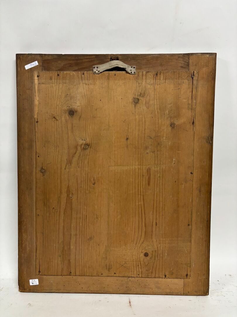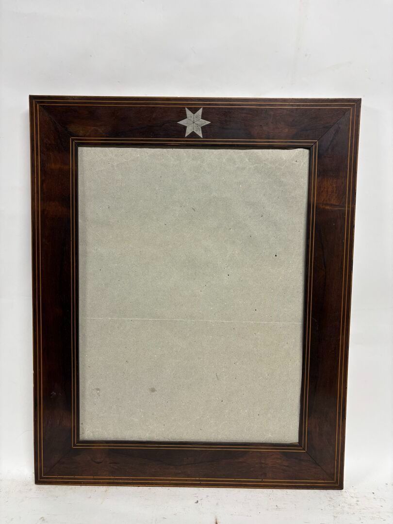 Fir wood frame, flamed mahogany veneer, light wood fillets and pewter star decoration on the pediment