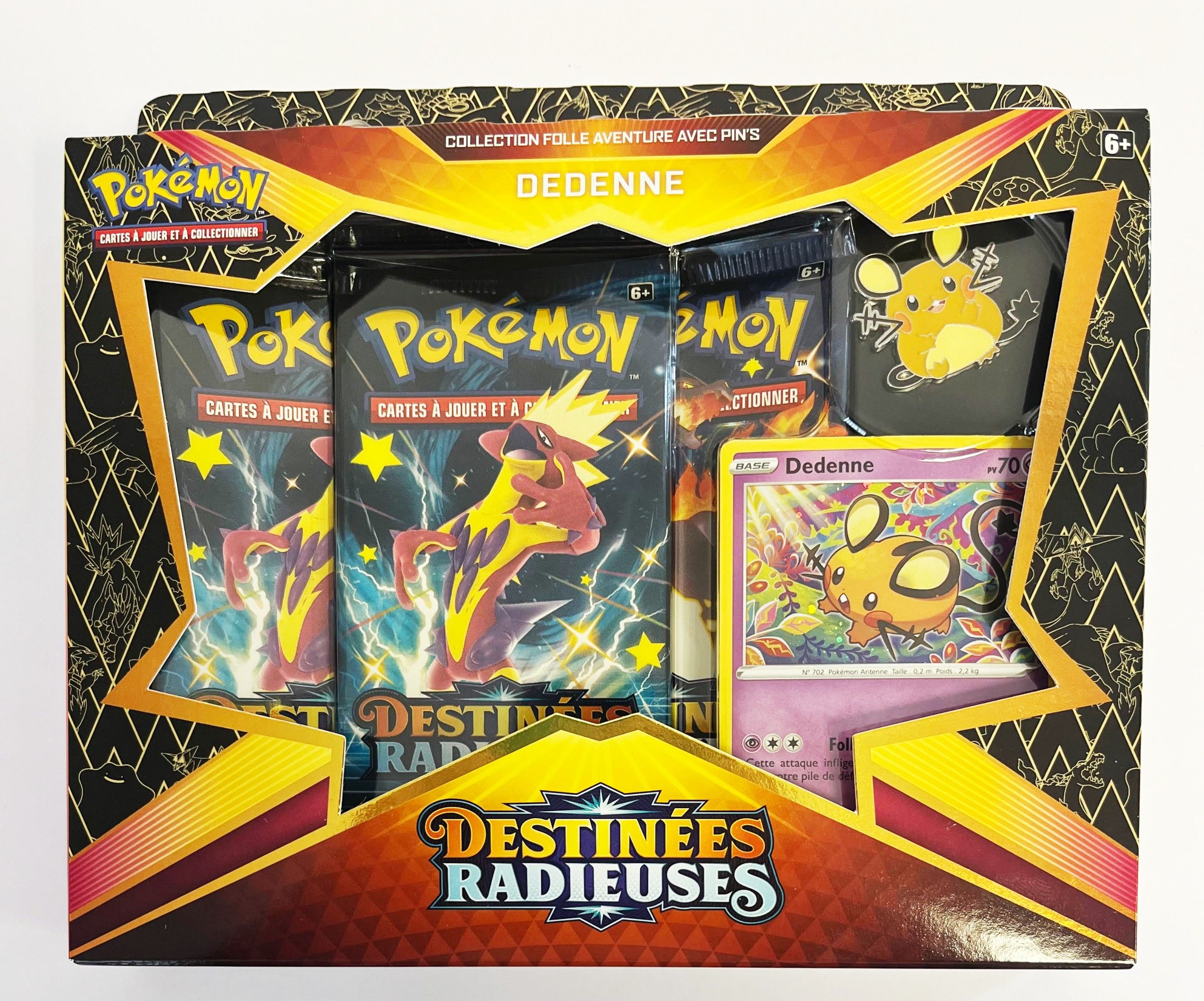 POKEMON. Folle Aventure Collection box set with pins, DEDENNE, DESTINEES RADIEUSES.