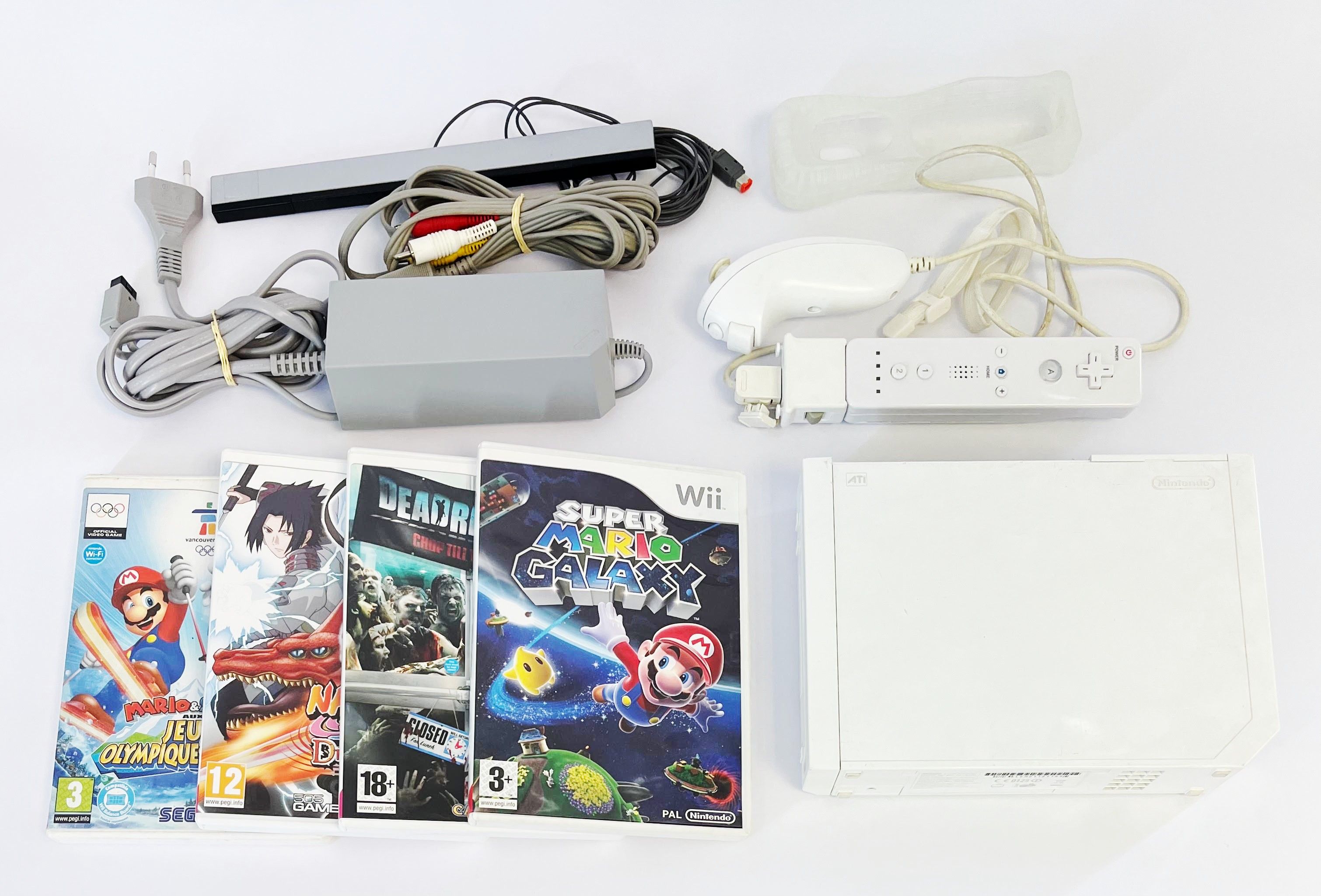 NINTENDO Wii console and 4 games: Super Mario Galaxy, Mario & Sonic at the Winter Olympics Deadrising and Naruto Shippuden. Not guaranteed. Not tested