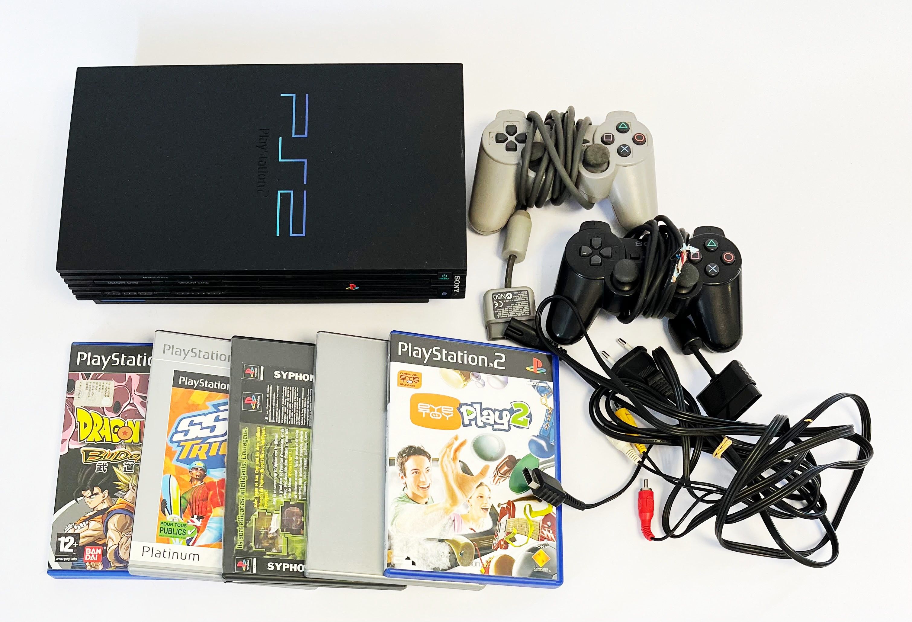 Playstation 2 console and 5 games: World challenger, Eye toy, Dragon ball Z, Syphon Filter 2 and SSX Tricky. Not guaranteed. Not tested