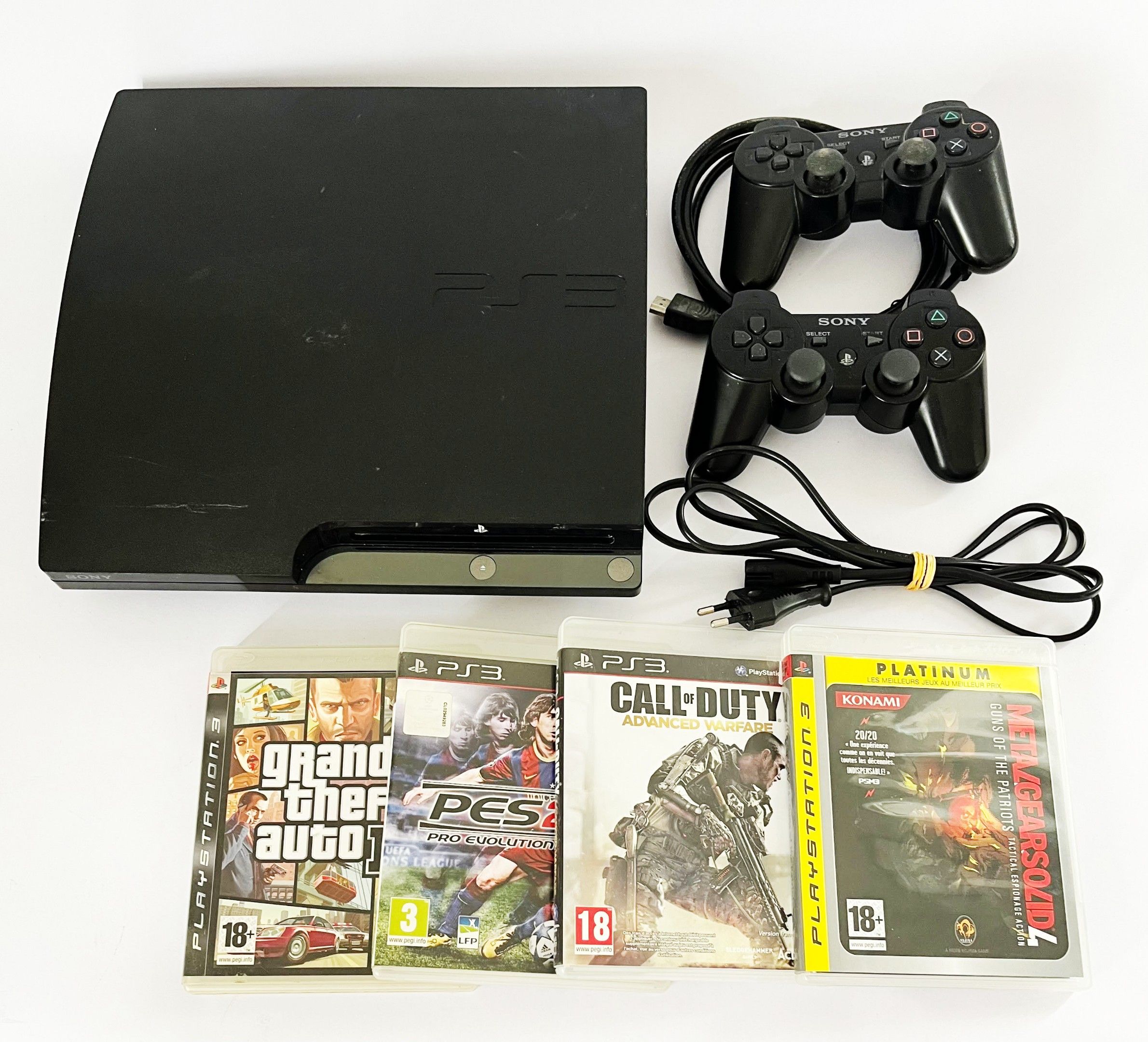 Playstation console and 4 games: Metal gear solid 4 guns of the patriots, Call of duty warfare, PES 2011 and GTA 4. Not guaranteed. Not tested