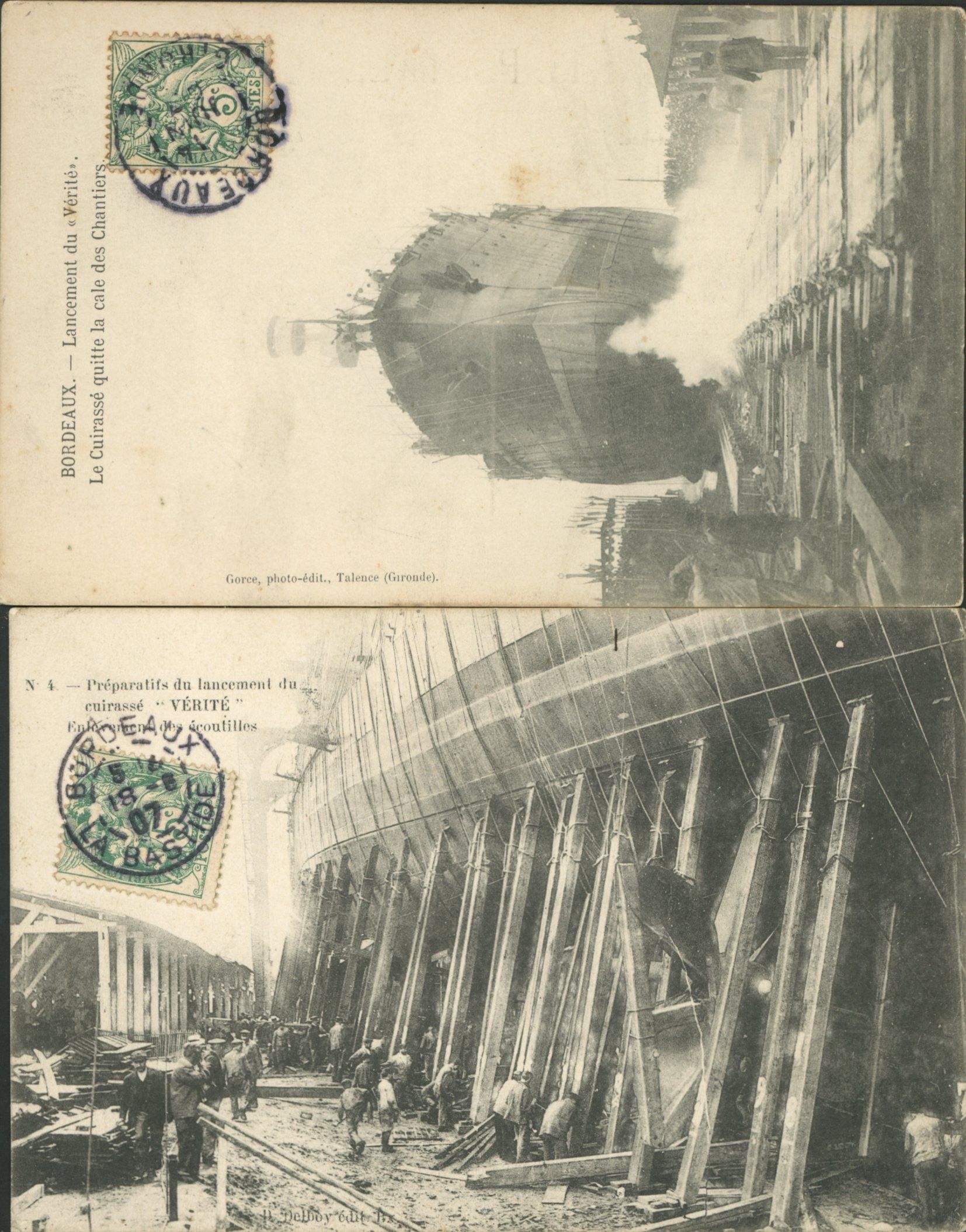 CPA: Set of 2 cards - Bordeaux (Gironde) - Preparations for the launch of the battleship "Vérité" - Removal of the hatches, and the launch of the "Vérité" - The battleship leaves the Chantiers hold