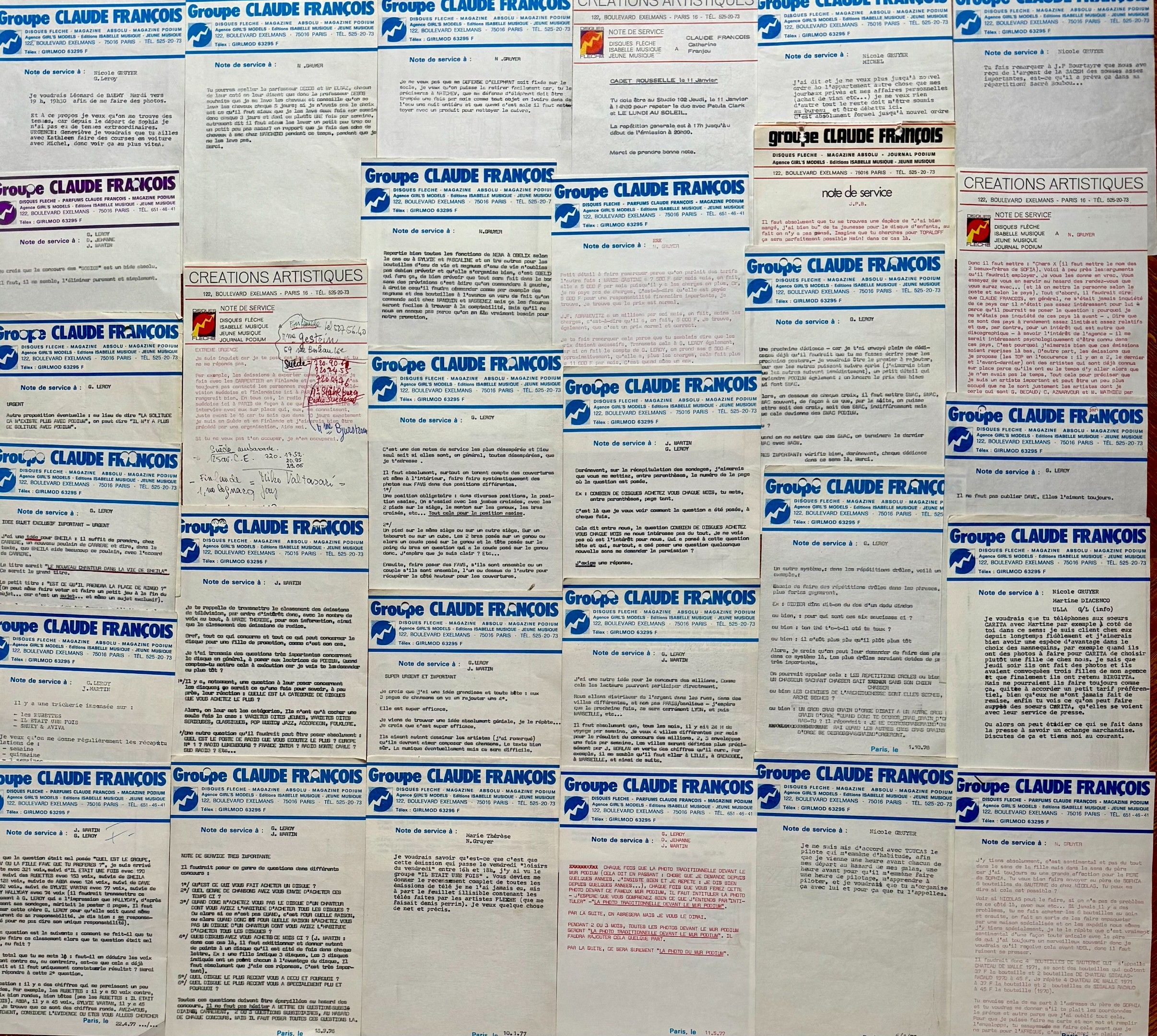 CLAUDE FRANCOIS / GROUPE CLAUDE FRANCOIS: A collection of 30 original memos dictated by the singer between 1972 and 1977. Precious documents of the artist's artistic life, as well as instructions left for the editors of his journal Podium and many personal reflections. Fine condition.