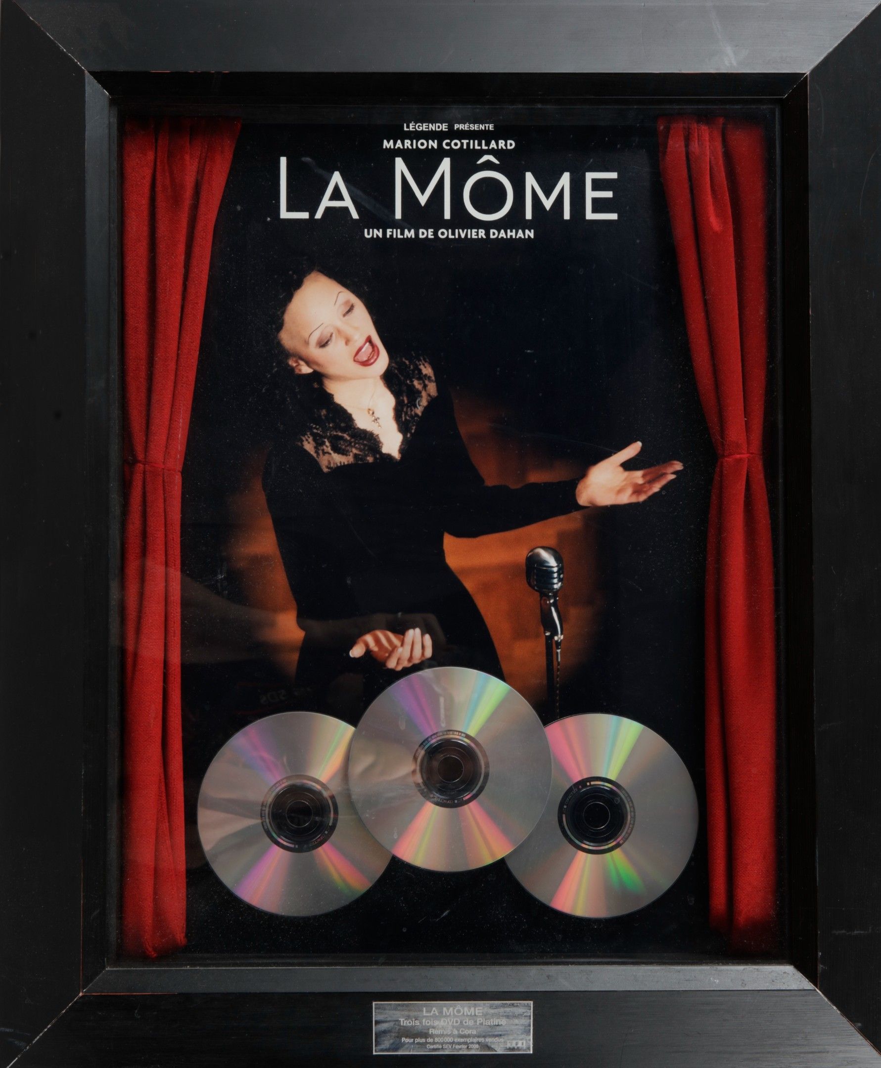 EDITH PIAF: A triple platinum DVD for Olivier Dahan's film "La Môme", which sold over 800,000 copies in February 2008. Certified SEV for TF1 Vidéo. Format 51x63 cm. Good condition.