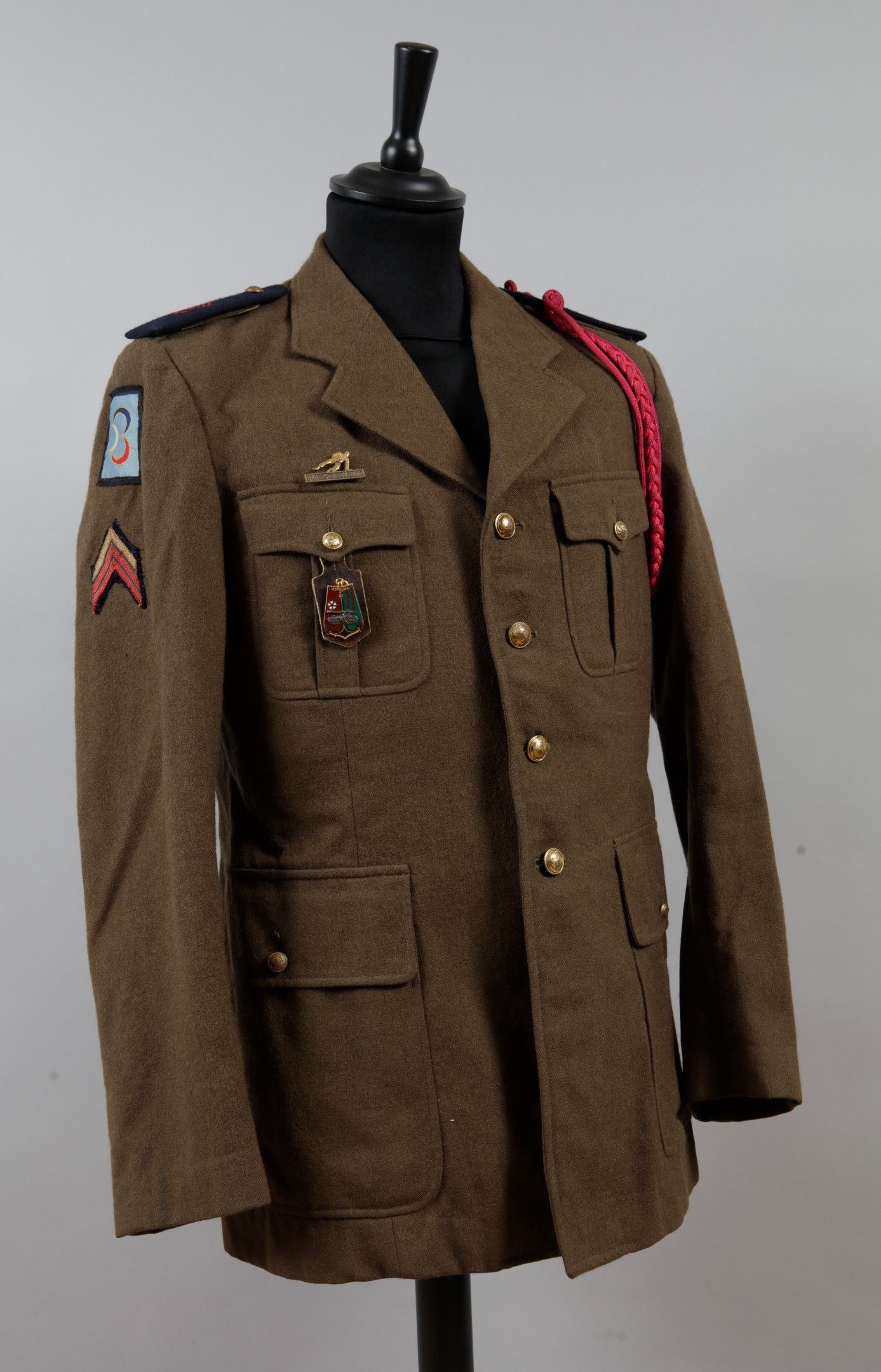 JOHNNY HALLYDAY: A military jacket given to the young rocker on the day of his call-up to the 43rd Armoured Marine Infantry Regiment in Offenburg in May 1964. The jacket, worn by Private Smet during his military service, features his regimental pucelle, his Brevet Sportif Militaire badge and his regimental fourragère. With 2 high patch pockets and 2 low patch pockets. An exit jacket that Private Smet, who became a Corporal and then a Master Corporal, wore with his successive ranks. Size 42. A historic piece in the history of the rocker.