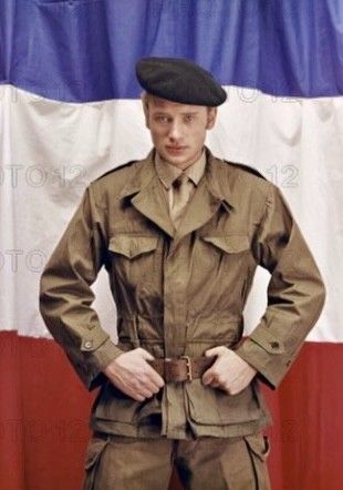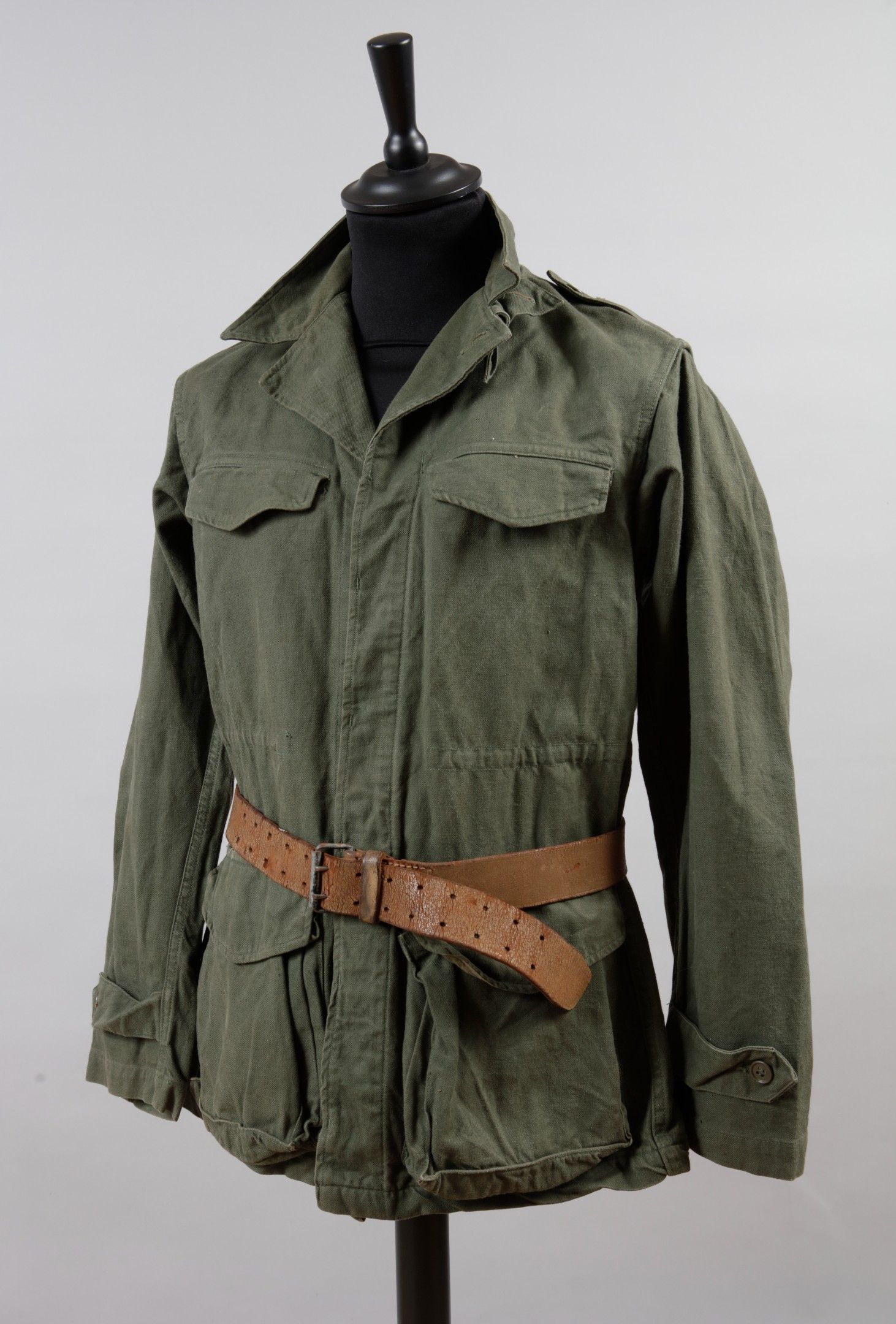 JOHNNY HALLYDAY: a single-breasted canvas military jacket, service model issued to Private Smet on his induction into the 43rd Armoured Regiment of Marine Infantry in Offenburg in May 1964. With Roquette mark and the name SMET 64 on the label. Attached is a leather belt with reference 352/310 and the name Smet. Fair condition.