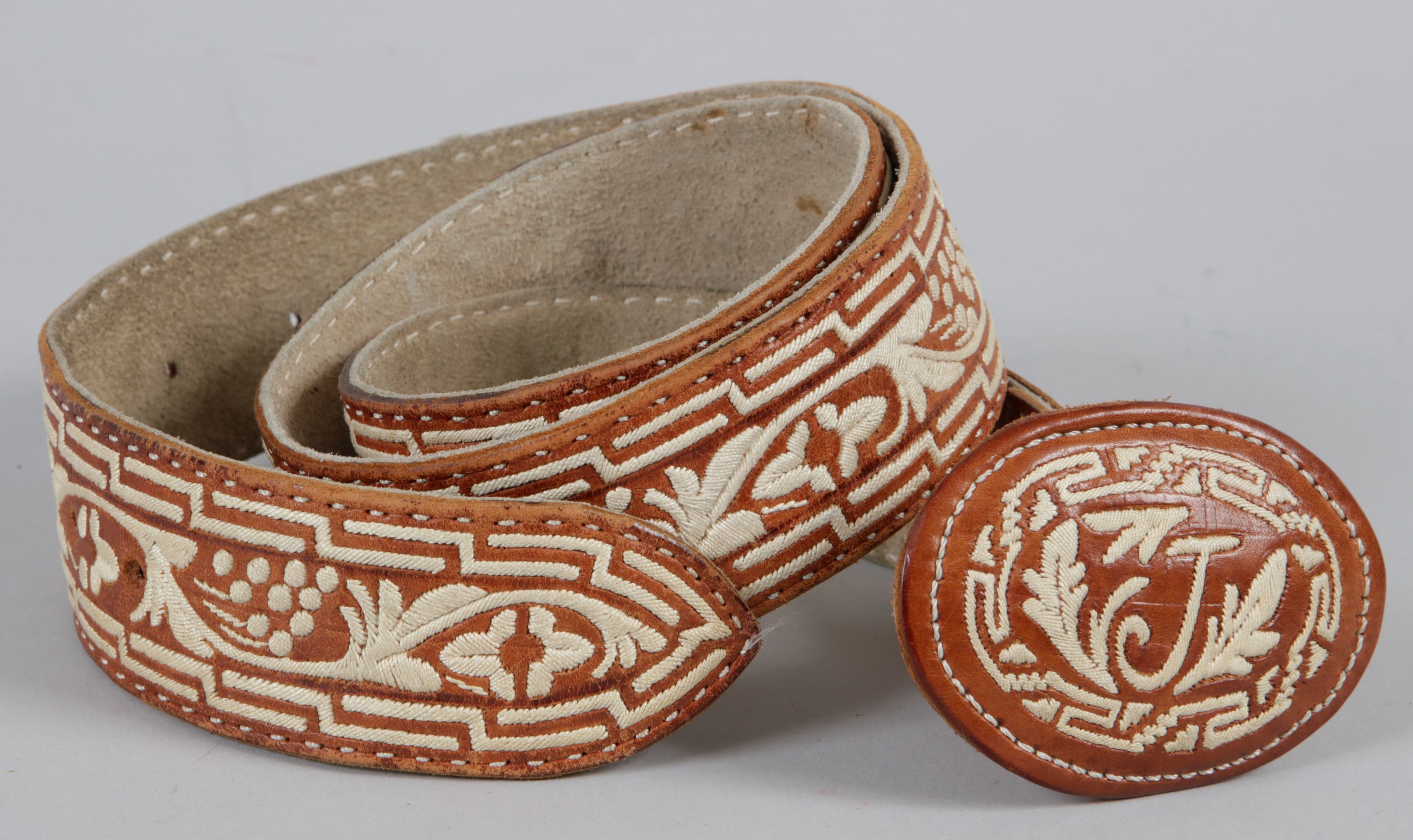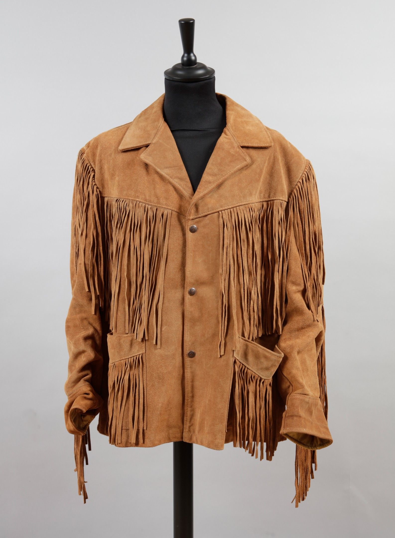 JOHNNY HALLYDAY: A Western by Schott suede jacket with fringes, bought in the USA and worn by the rocker in the early 70s. With 2 lower pockets. Press studs. Size 44. Unique and rare item. Good condition. Attached is a brown leather city belt, worn during the 70s by the rocker. With white cotton thread floral embroidery on the leather and an oval leather buckle with the initial J embroidered on it. Length 124 cm.