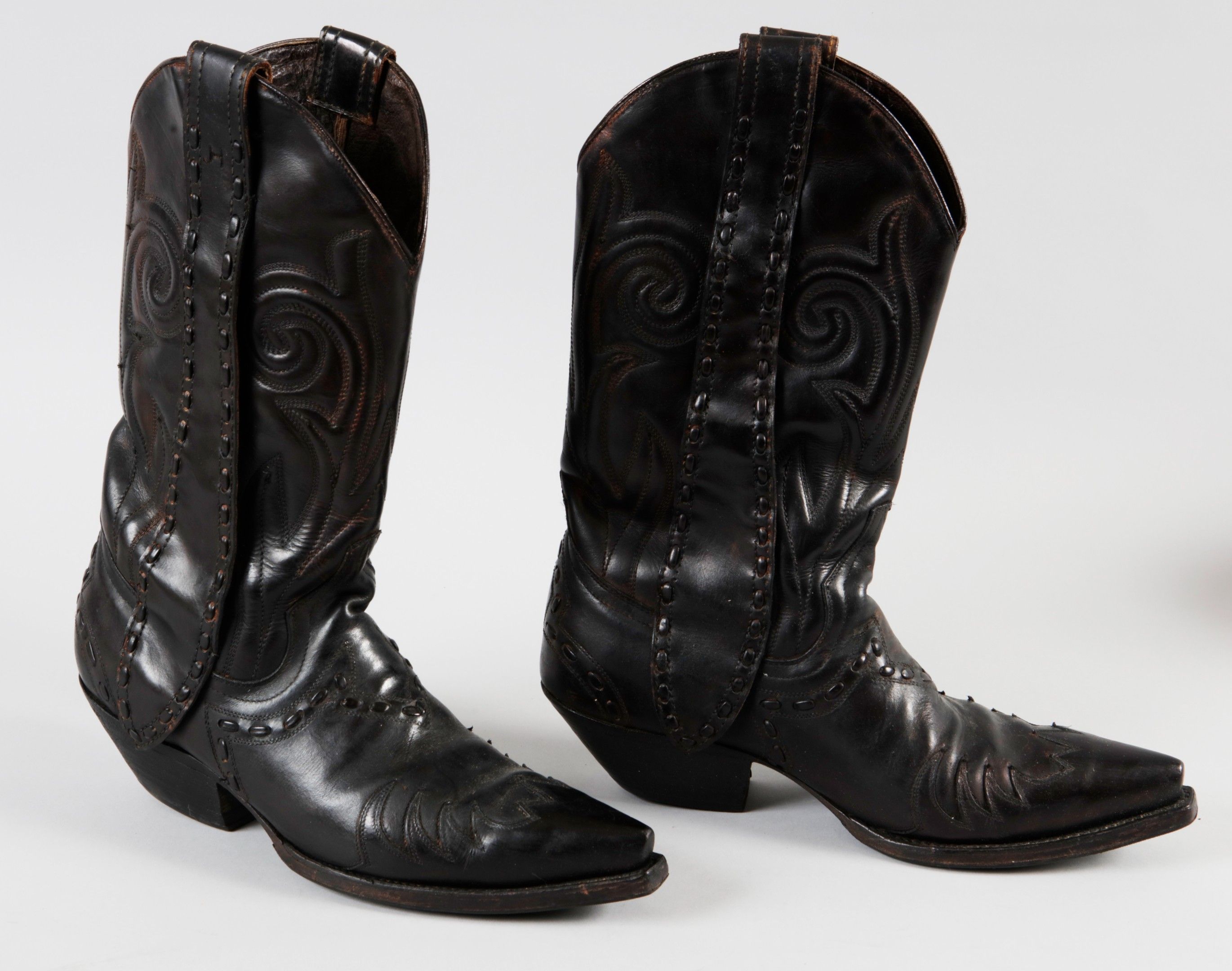 JOHNNY HALLYDAY: A pair of brown leather Mexican mule-eared boots, bought in the USA and worn by the rocker in the 70s. Traces of use. Good condition. 800/900.