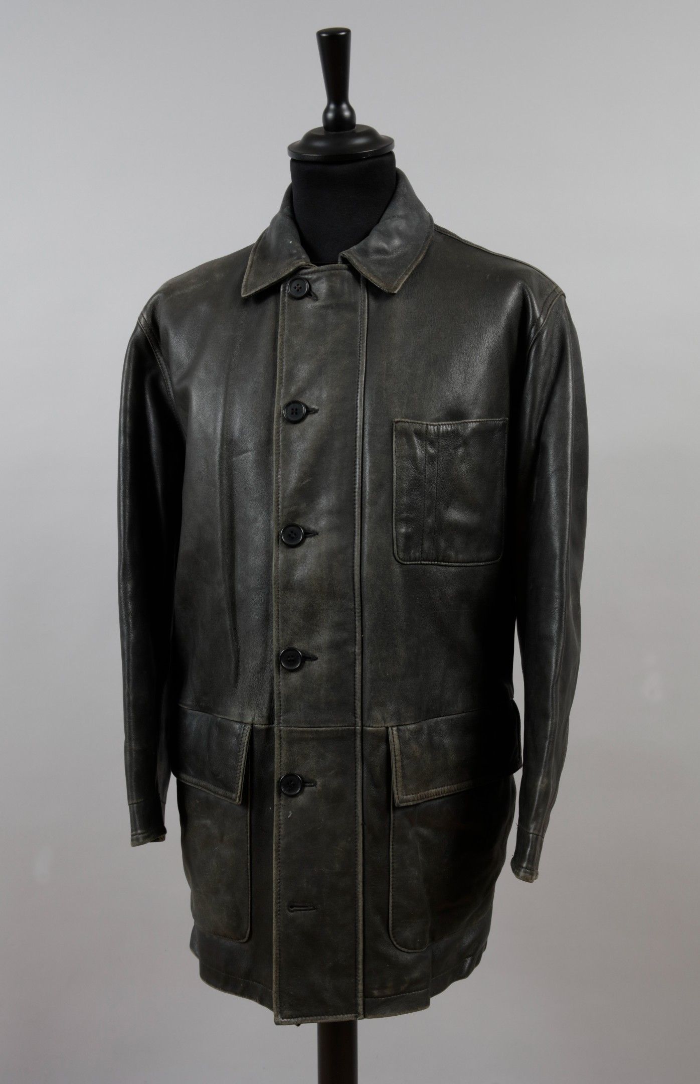 JOHNNY HALLYDAY: A black leather winter jacket from Façonnable Jeans, bought and worn by the rocker in the 80s. With a top patch pocket and 2 lower pockets with lapels. Double zip and button fastening. Good condition