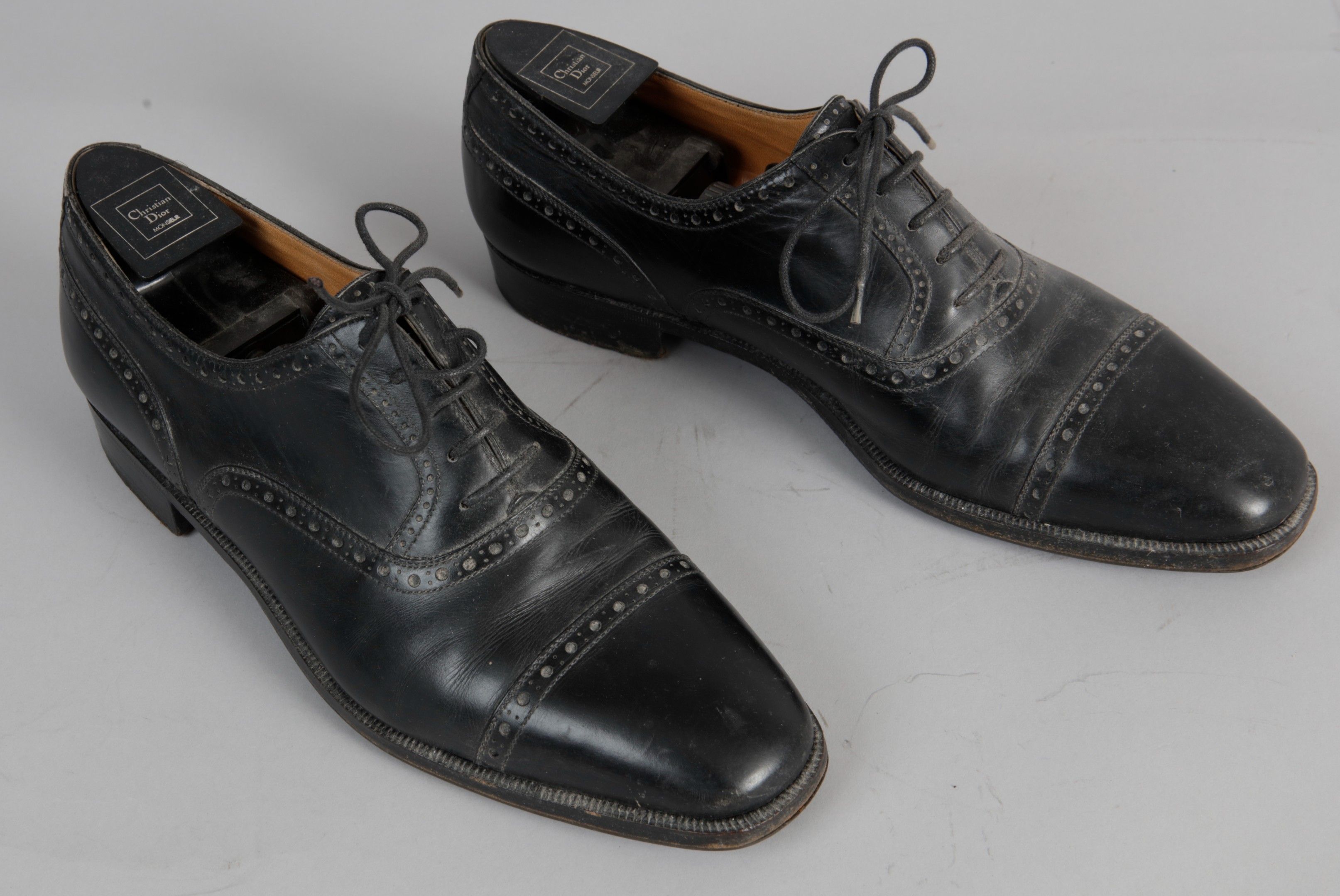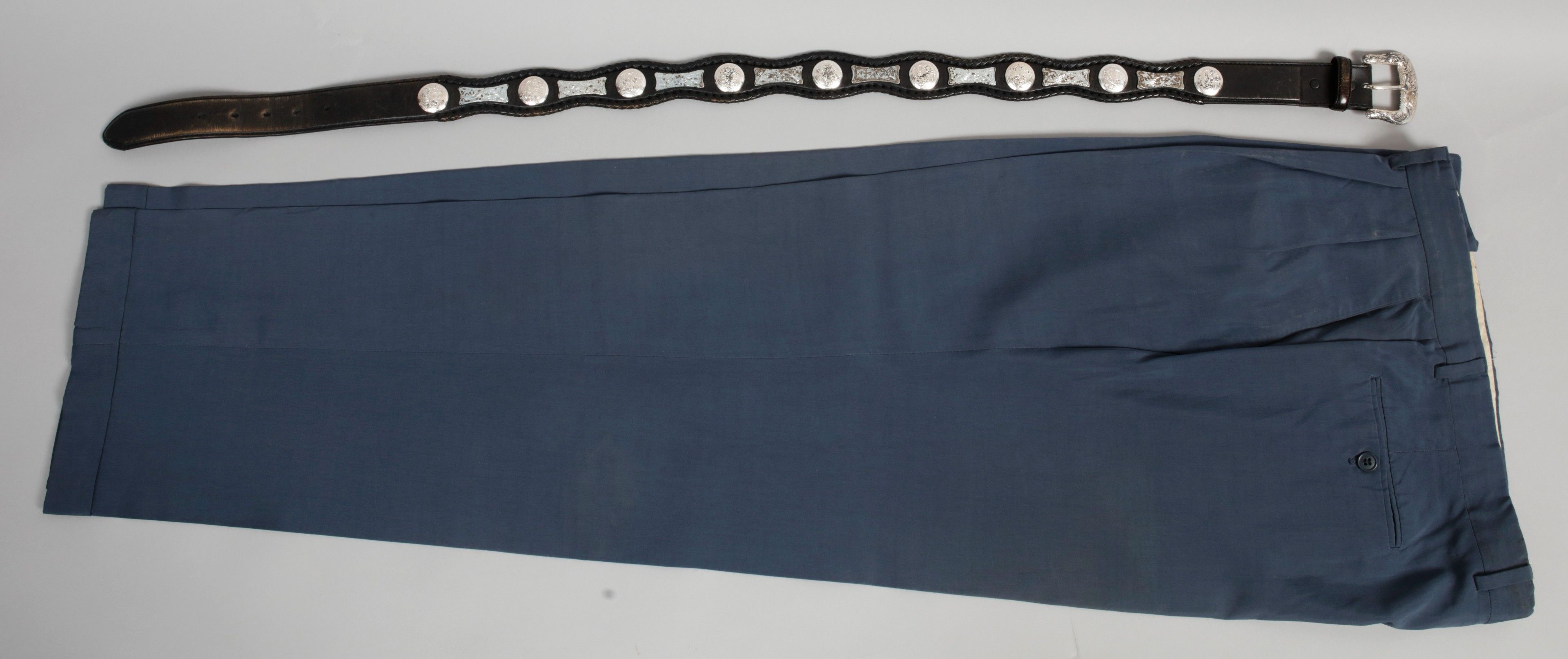 JOHNNY HALLYDAY: A blue silk suit by Christian Dior Monsieur, bought and worn by the rocker. Size 54. Nice condition. Attached is the belt Johnny wore with this suit and a pair of Christian Dior Monsieur shoes with Dior shoe trees.