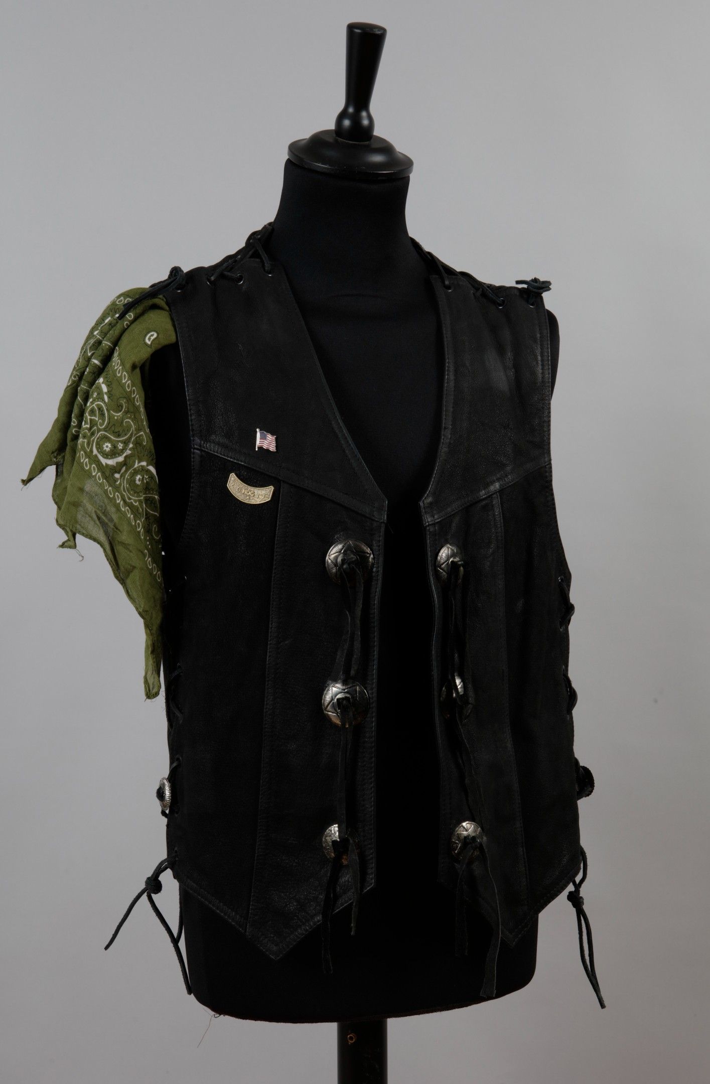 JOHNNY HALLYDAY: A Roadwear Fifty Nine sleeveless nubuck waistcoat, bought in the USA and worn by the rocker. With 6 conchos and 2 mini-conchos on the side. With 2 pins on the upper left chest and with a green bandana. Good condition.