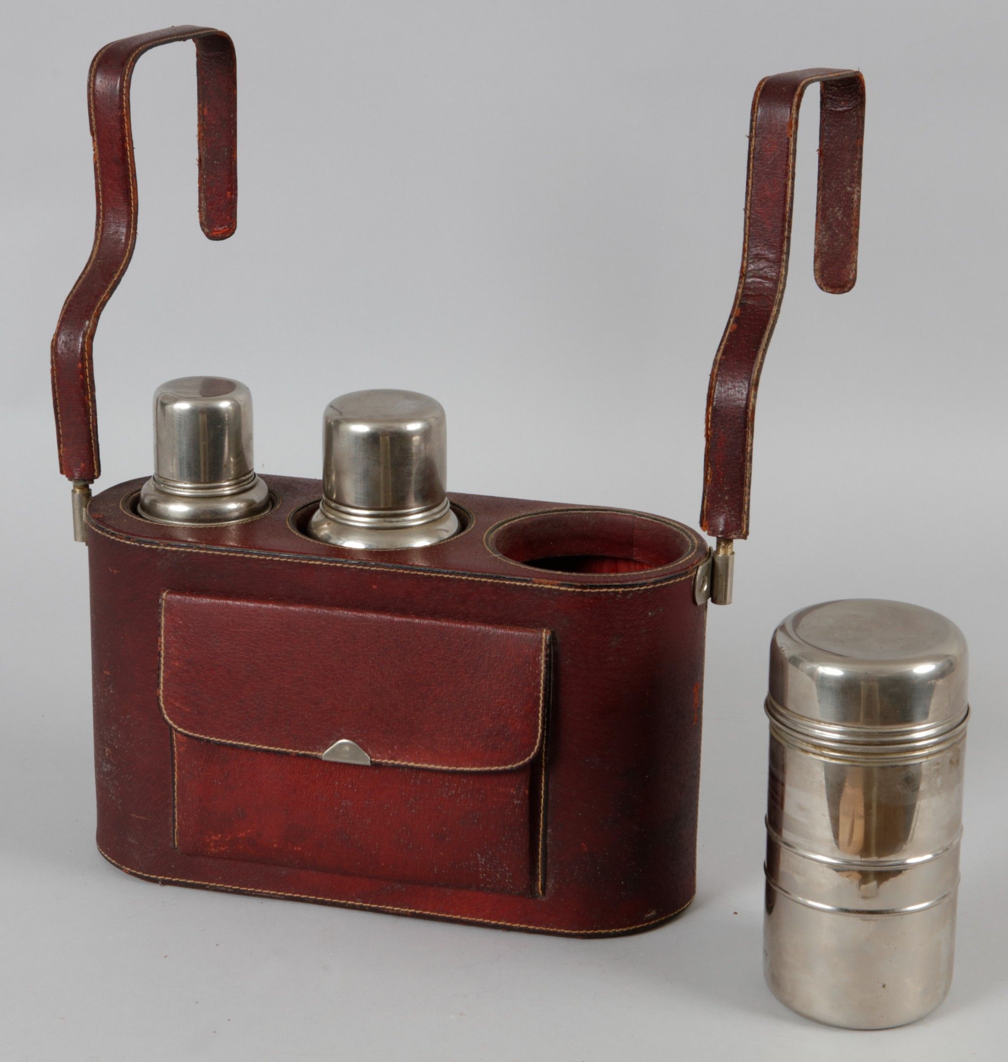 JOHNNY HALLYDAY: A set of 2 Harley-Davidson soft leather panniers, purchased in Los Angeles and fitted to the rocker's 1992 Harley-Davidson Softail motorbike. Nice condition. Also included is a set of 2 thermos flasks and 1 bottle, leather-wrapped, bought by the rocker in the USA and used on road trips. With two systems for attaching the set to the luggage rack during a stop. This set was included in one of the Harley-Davidson panniers. Very good quality, in beautiful original condition.