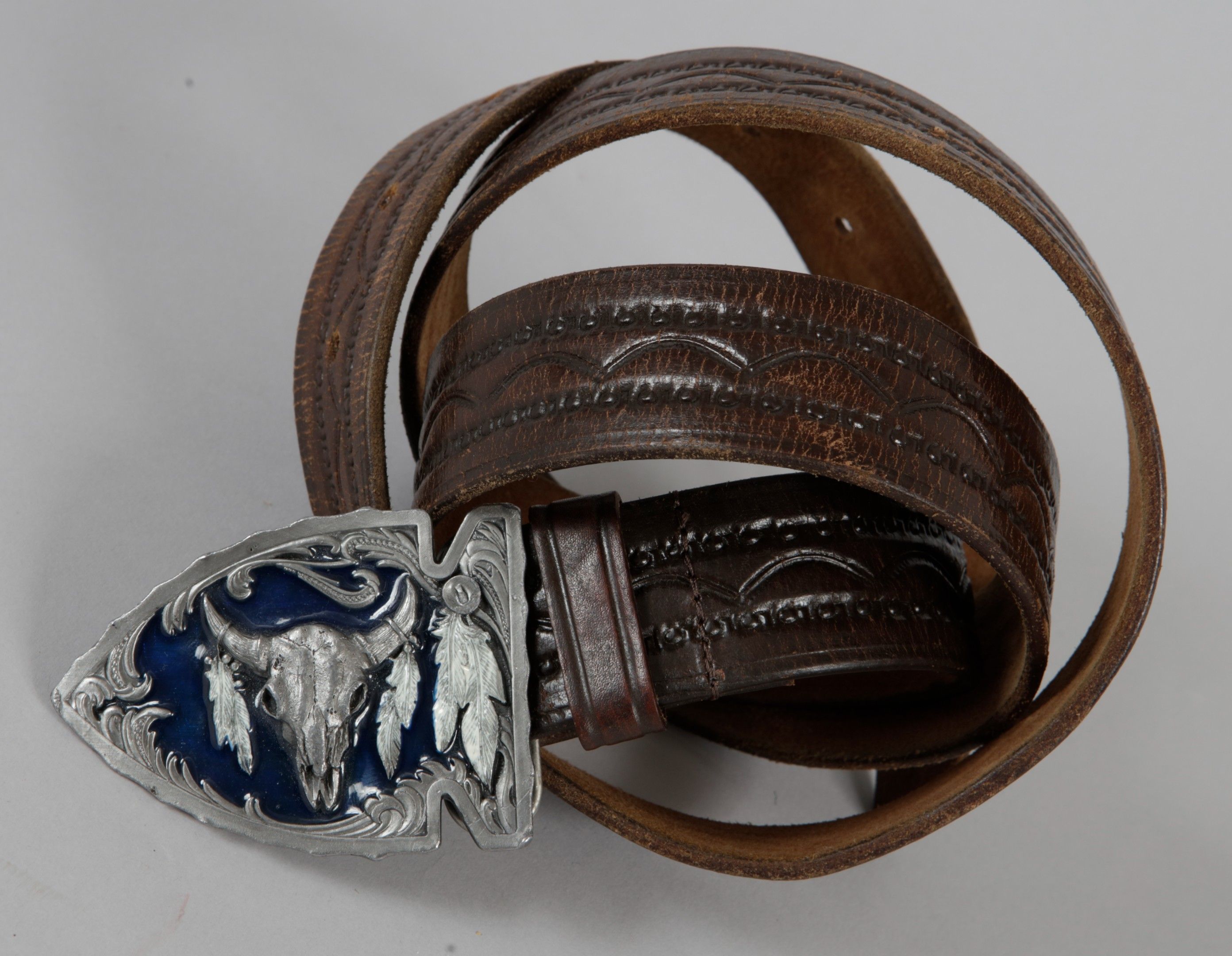 JOHNNY HALLYDAY: A brown leather city belt, bought in the USA and worn by the rocker during the 90s. Siskiyou model - N°960505. With its metal buckle engraved with a buffalo head and 6 feathers. Length 130 cm. Good condition.