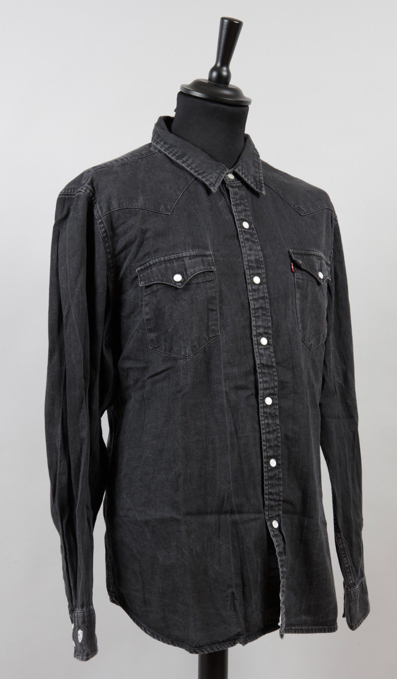 JOHNNY HALLYDAY: A black cotton shirt from Levi's, bought in the USA and worn by the rocker during the 90s. With 2 chest pockets and mother-of-pearl press stud fastening. JH initials embroidered on the 2 cuffs. Size XXL. Good condition.