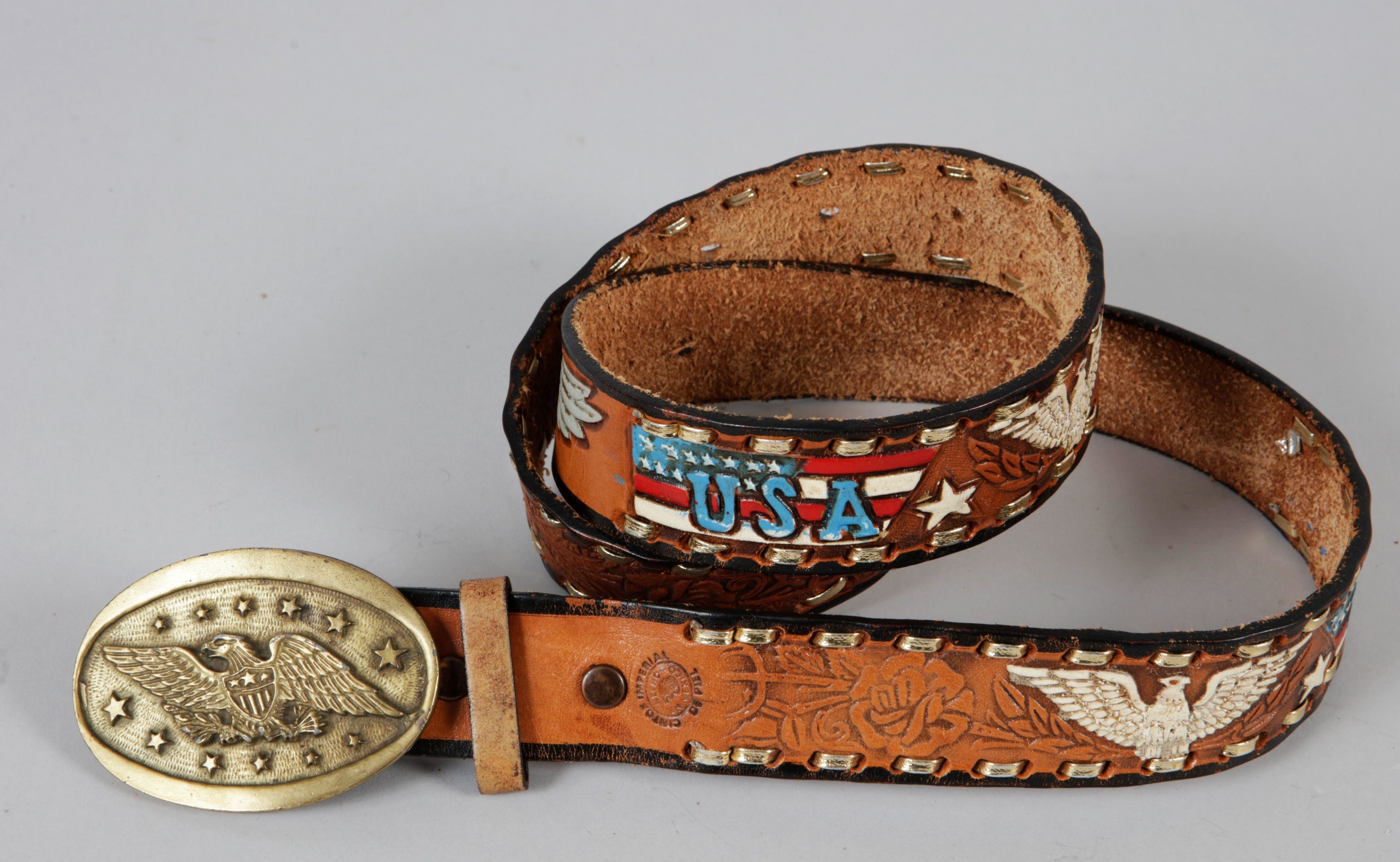 JOHNNY HALLYDAY: A brown leather belt, USA model from 1990, with three white and blue eagles. Purchased in the USA and worn by the rocker in the early 90s. Metal buckle with eagle motif and 12 stars. Length 110 cm. Good condition.