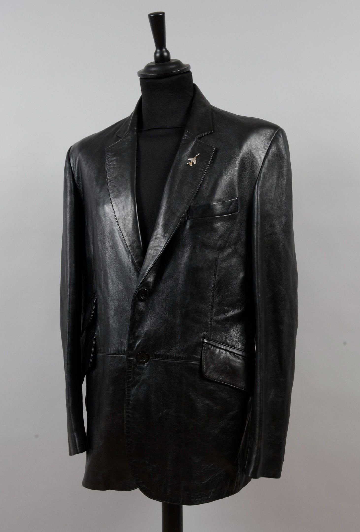 JOHNNY HALLYDAY: A black leather city jacket (dipped lambskin), by Jamie Page, bought and worn by the rocker in the 2000s. With 1 aeroplane pin on the left lapel. With 3 low lapel pockets. Long worn by Johnny. Size 54. Good condition.
