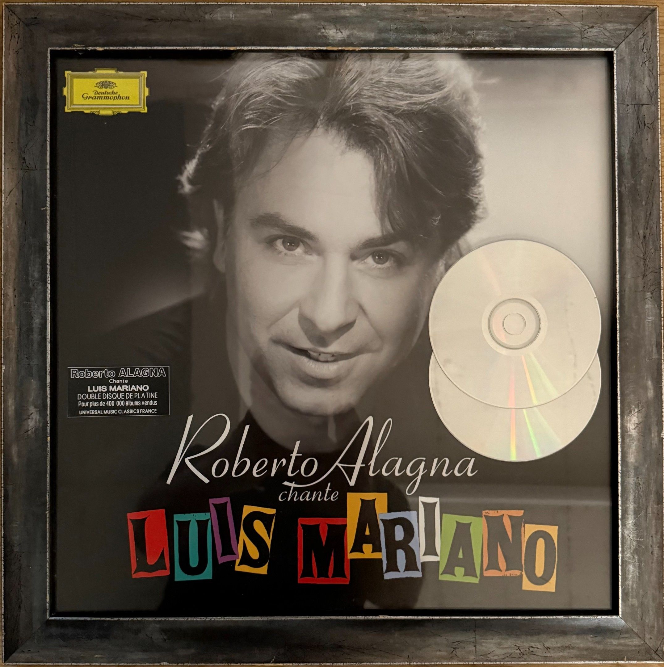 ROBERTO ALAGNA (1963): A double platinum disc for the album "Roberto Alagna chante Luis Mariano", which sold over 400,000 copies in November 2006. Certified by Snep for Universal and Deutsch Grammophon. Format 44x44 cm. Good condition.