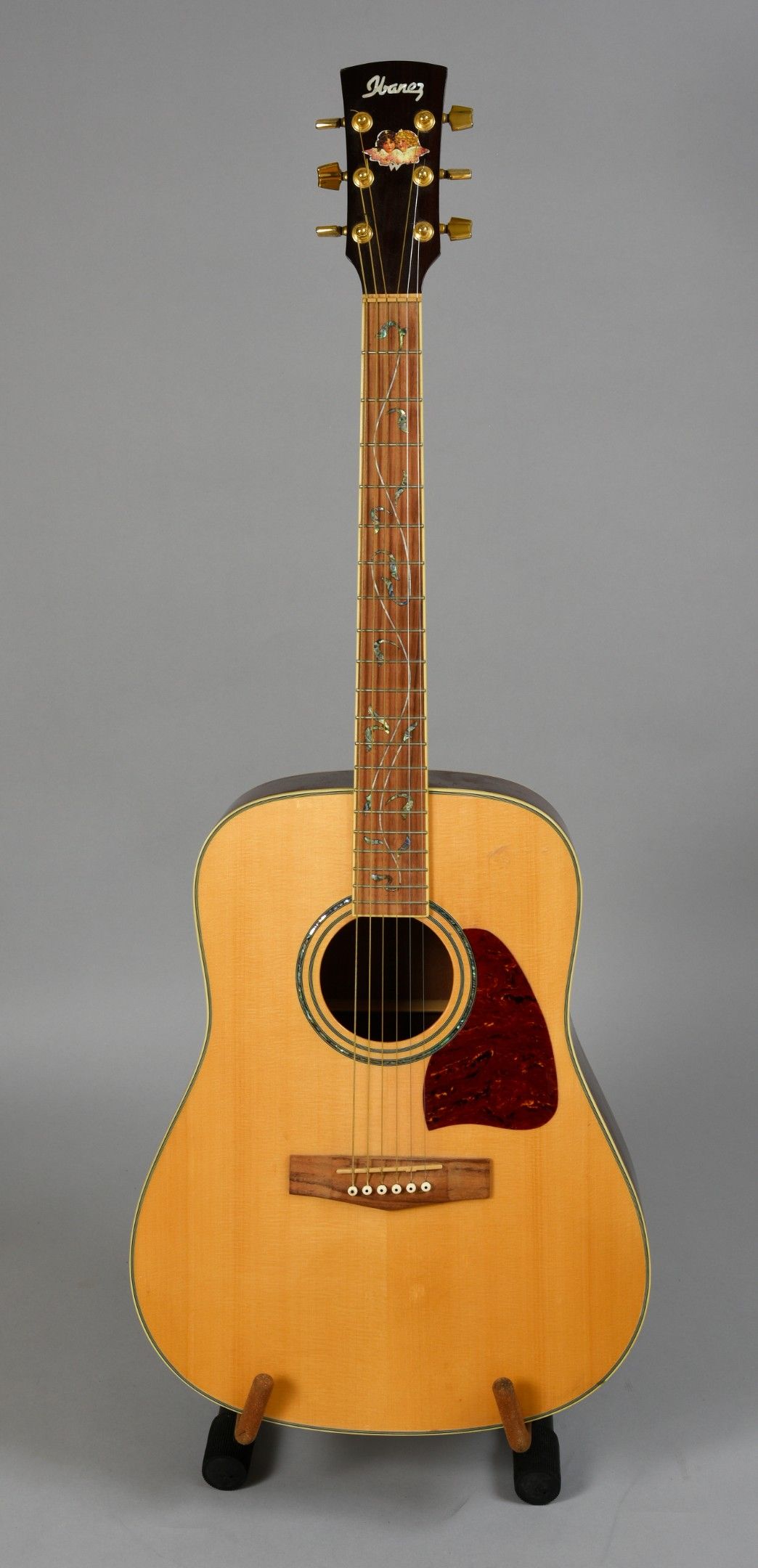 FRANCK ALAMO (1941/2012): An original Ibanez guitar. Reference PF5MS / S98110511. 1 6-string guitar, wood tone, bought by the singer in the 80s. Good condition.