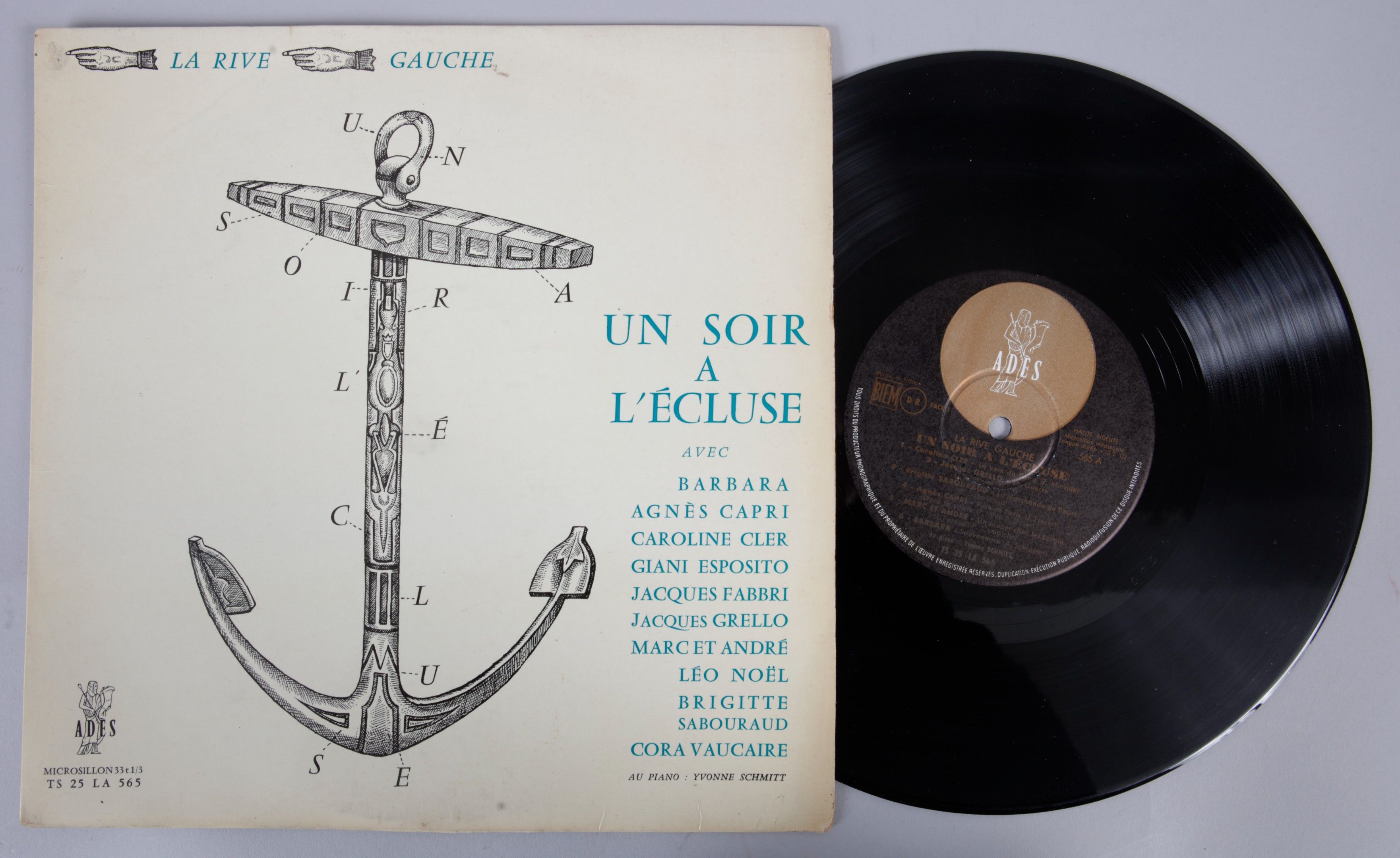 BARBARA (1930/1997) : A 25cm, 33rpm vinyl record "Un soir à L'Ecluse", published by Lucien Adès in 1964 and sold exclusively at Cabaret l'Ecluse in Paris. A compilation of several artists: Caroline Cler, Jacques Grello, Brigitte Sabouraud, Agnès Capri, Marc & André, Barbara, Léo Noël, Giani Esposito, Jacques Fabri and Cora Vaucaire. Courtesy of Pathé Marconi. Recorded live at Cabaret L'Ecluse. Grand Prix du Disque Français. Edition of 1000 copies. A rare record.