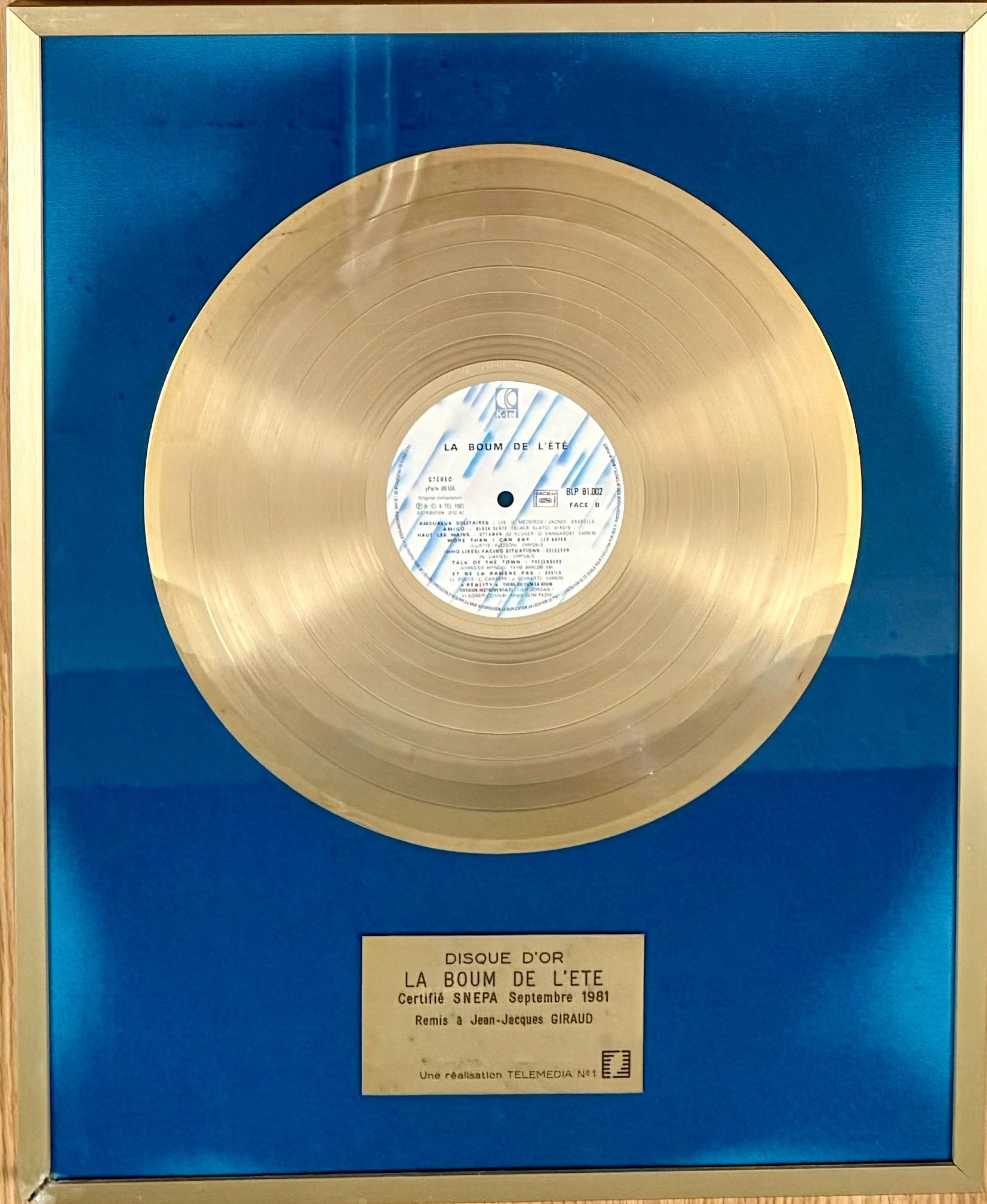LA BOUM DE L'ÉTÉ: A gold disc for the album "La Boum de l'été", published for Télémédia N°1 by K-Tel and selling over 100,000 copies in September 1981. Artists participating: Lio, Black Slate, Ottawan, Léo Sayer, Selector, Pretenders, Sheila and Vladimir Cosma. Certified Snepa and presented to Jean-Jacques Giraud. Fine condition.