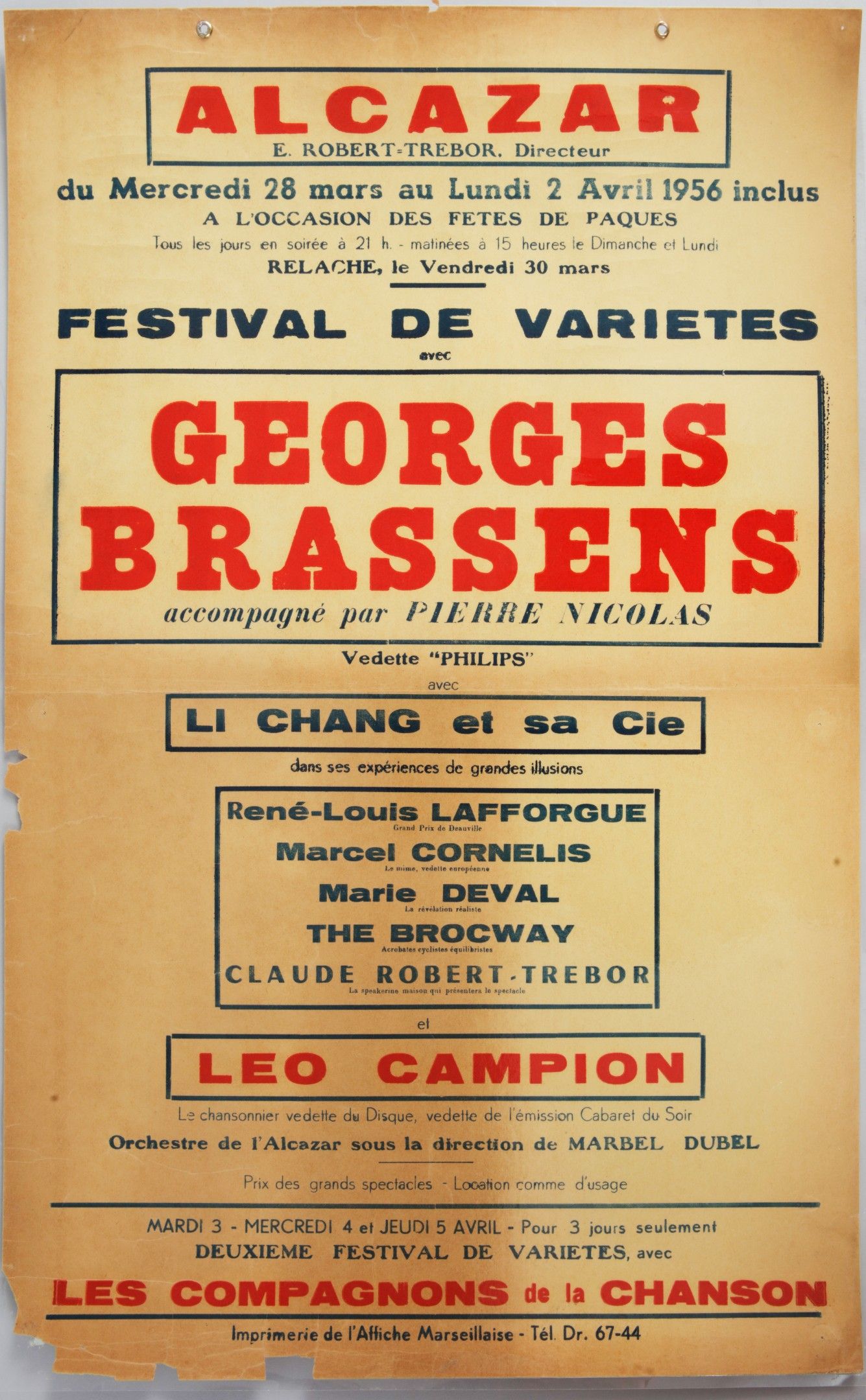 GEORGES BRASSENS: An original poster announcing Georges Brassens' concerts at L'Alcazar in Marseilles from Wednesday 28 March to Monday 2 April 1956. Format 40x64 cm. Rare original laminated poster.