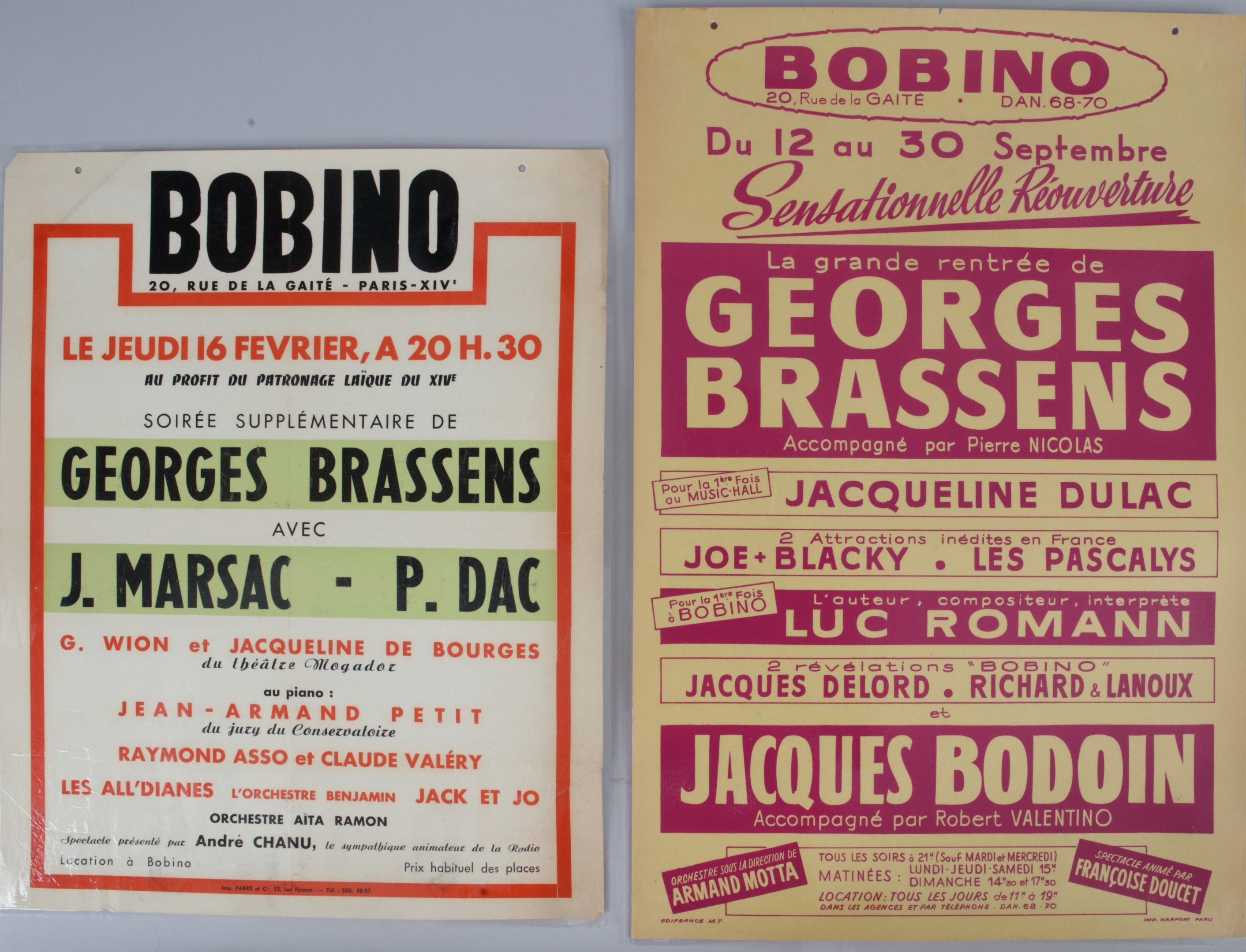 GEORGES BRASSENS: A set of 2 original posters announcing Georges Brassens' concerts at Bobino in 1954 and 1963. Format 40x57 cm. Original laminated posters.