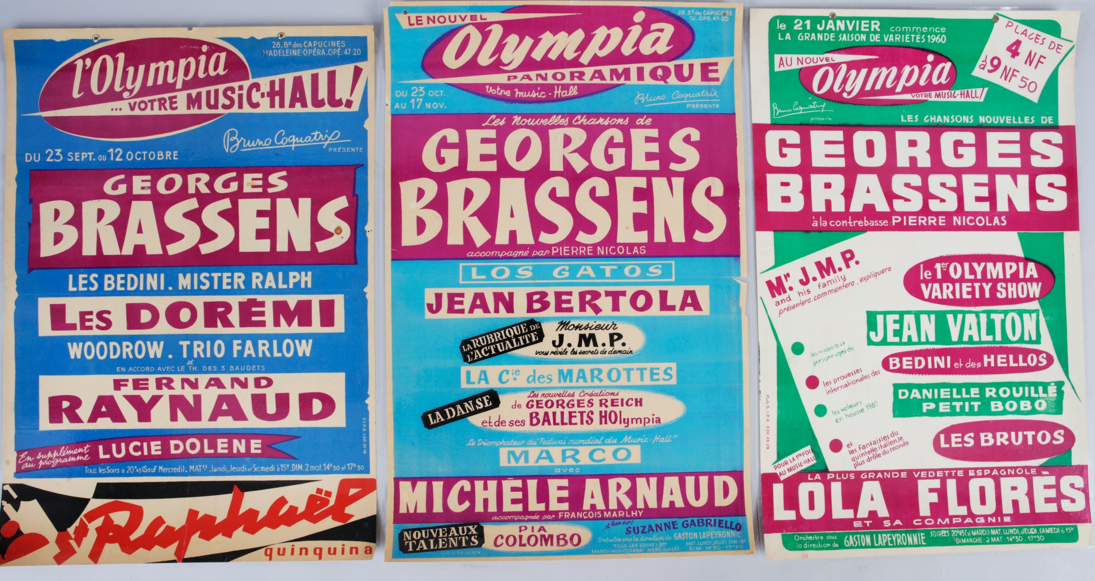GEORGES BRASSENS: A set of 3 original posters announcing Georges Brassens' concerts at the Olympia in 1954, 1958 and 1960. Format 40x60 cm. Original laminated posters.