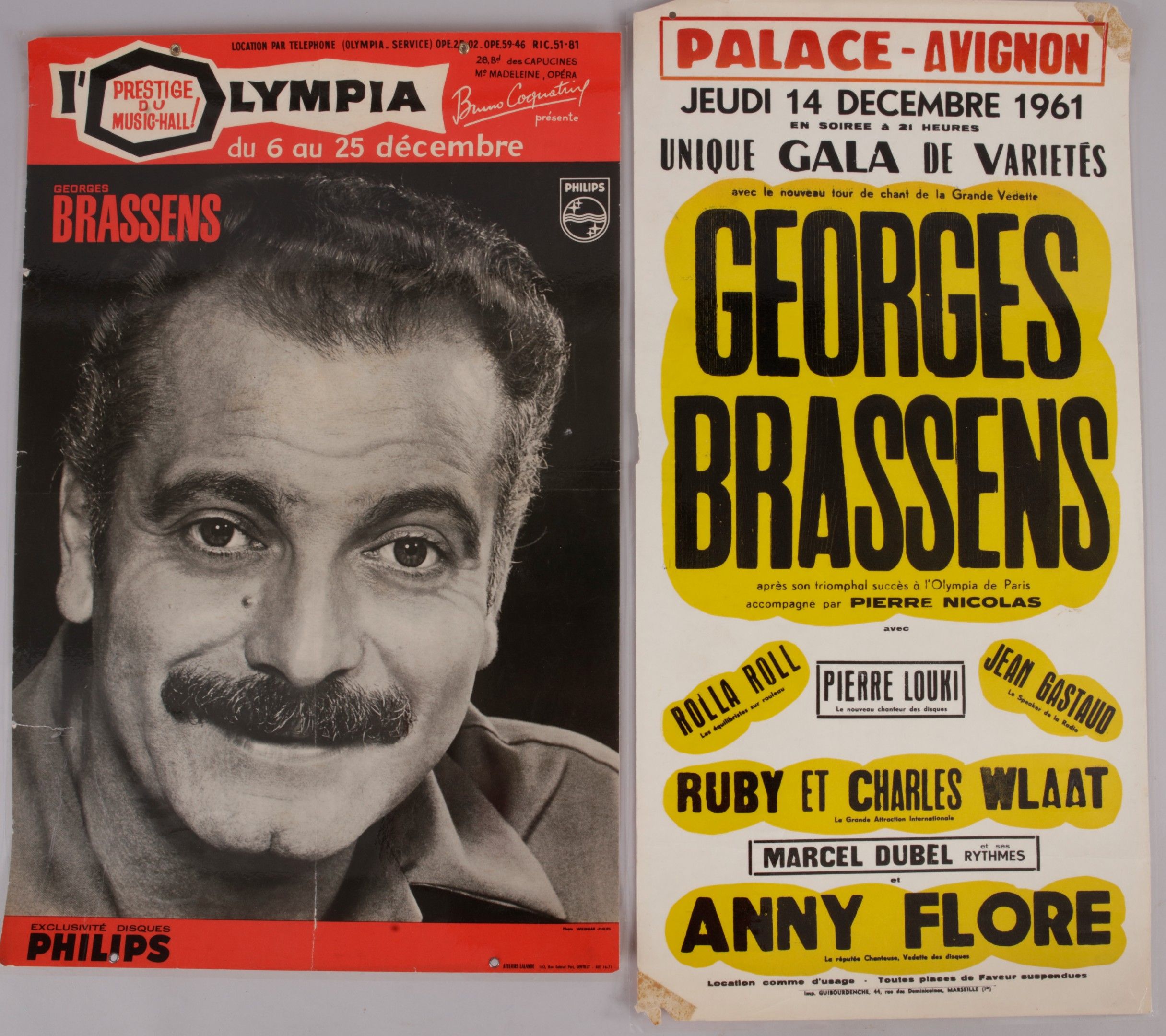 GEORGES BRASSENS: A set of 2 original posters announcing Georges Brassens' concert at the Palace in Avignon on Thursday 14 December 1961. Format 32.5x65 cm. Attached is 1 poster announcing the artist's concerts in 1961. Original laminated posters.