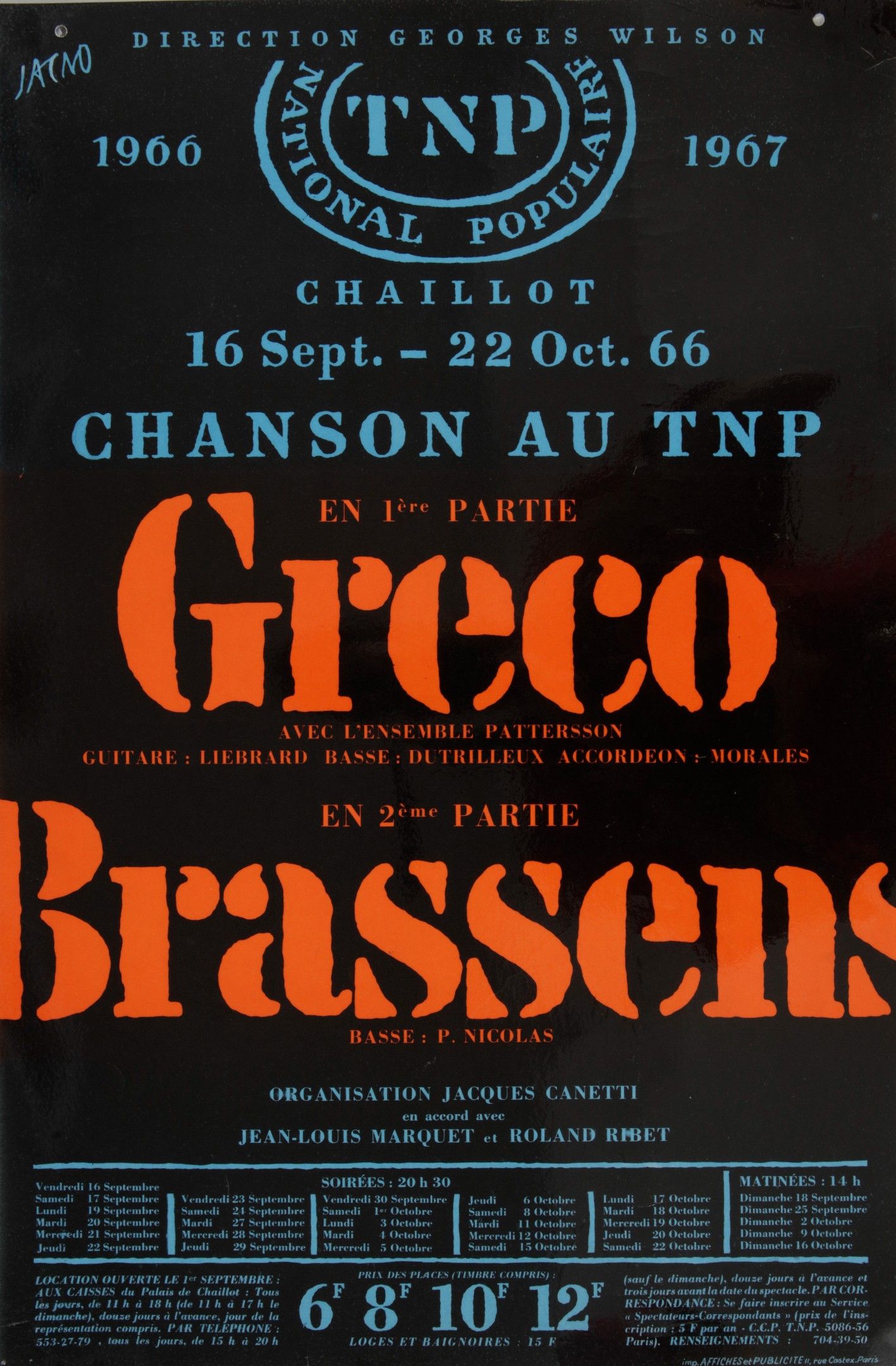 GEORGES BRASSENS: An original poster announcing concerts by Georges Brassens and Juliette Gréco at the TNP-Chaillot from 16 September to 22 October 1966. Format 40x60 cm. Laminated poster by graphic designer Jacno.