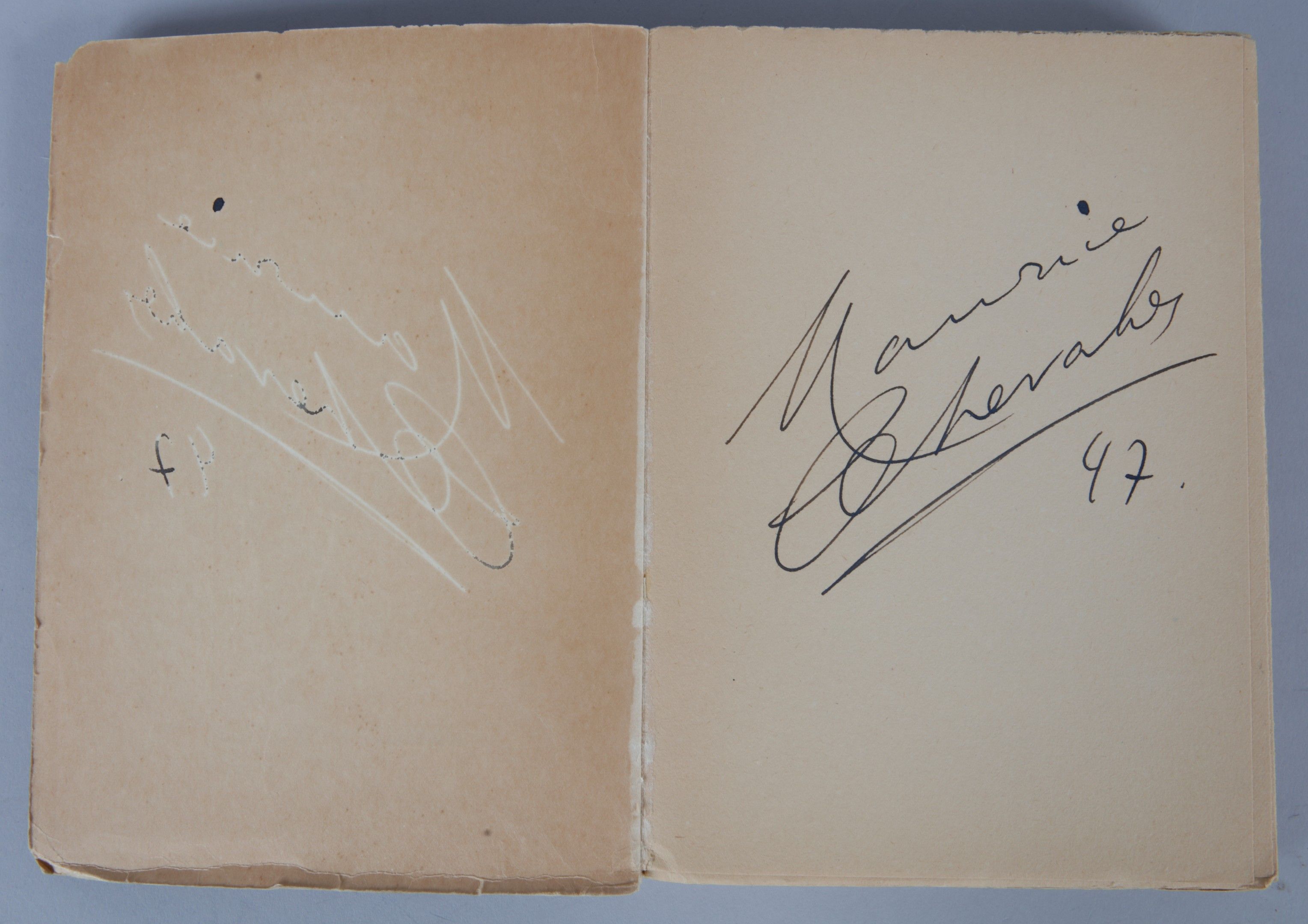 MAURICE CHEVALIER (1888/1972) : A book " Londres Hollywood Paris " in the original edition of 1947, published by Julliard and dedicated by the artist. 242 pages - Format 14x19,5 cm. Good condition.