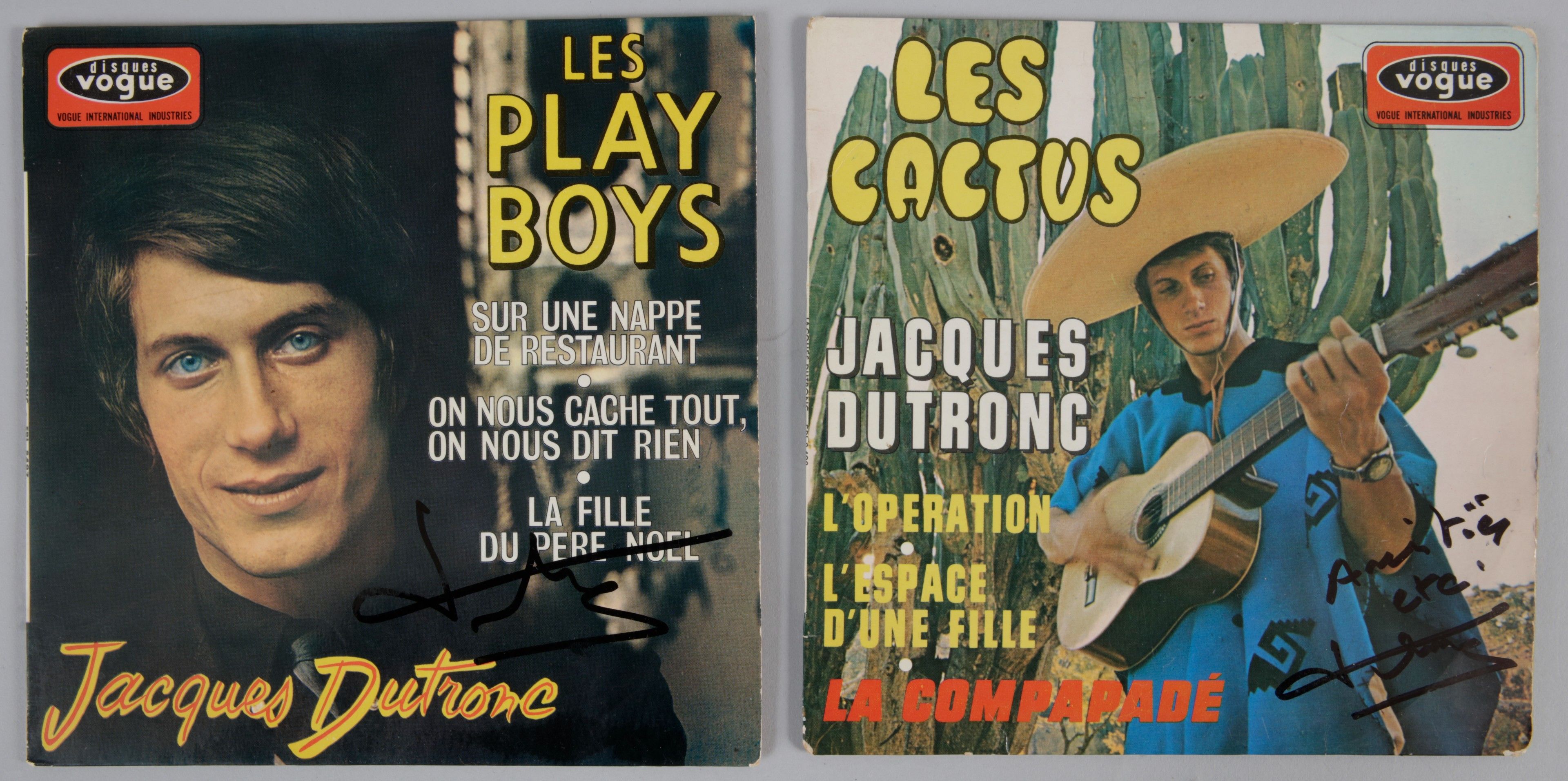JACQUES DUTRONC: a set of 2 original 45rpm vinyl records autographed by the artist: Les Cactus and Les Play-Boys. Good condition.