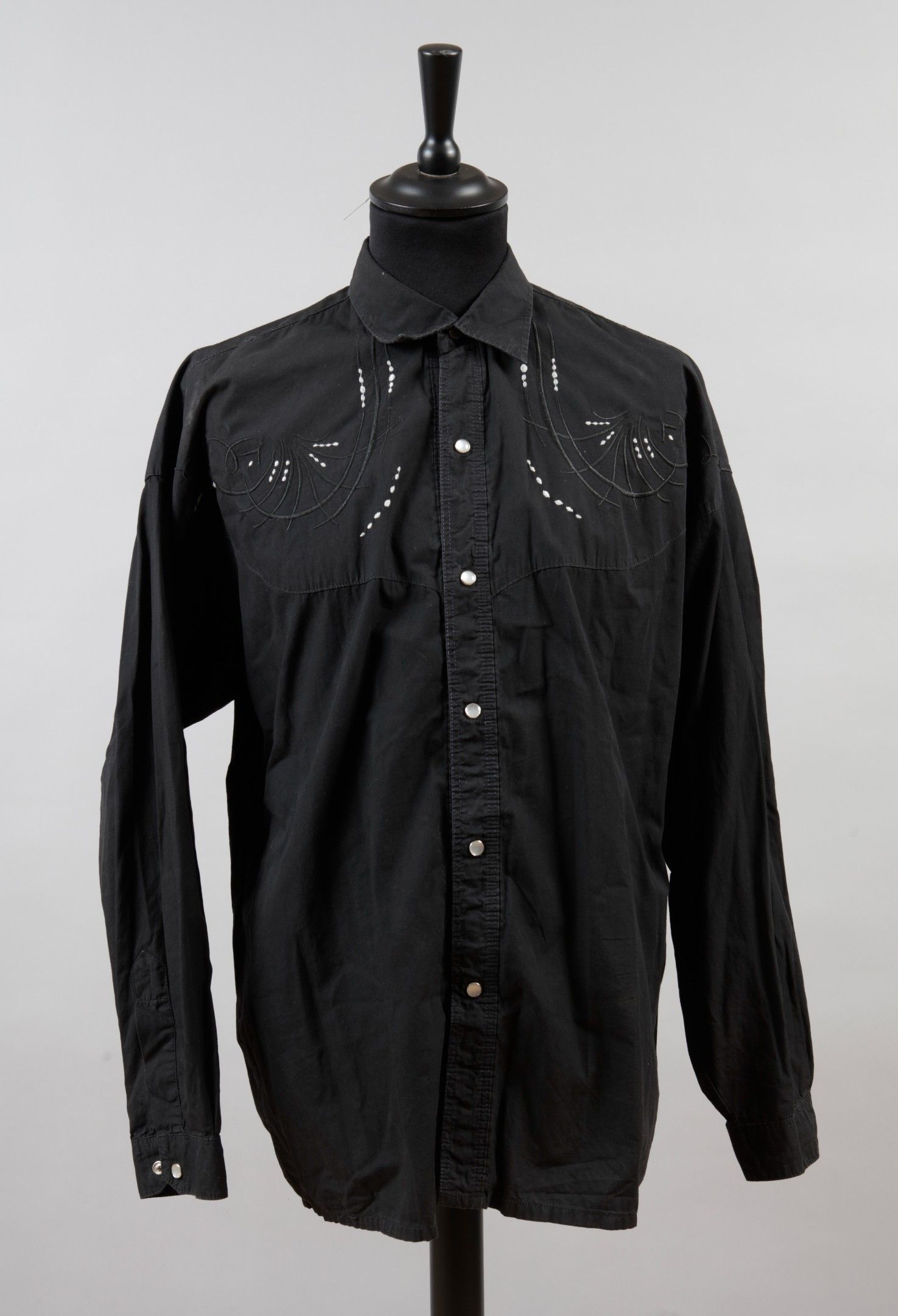 JOHNNY HALLYDAY: A black cotton shirt by Western Passion - Johnny Hallyday, worn by the rocker on television in 1991 to perform "Casser la voix" as a duet with Patrick Bruel. With embroidered white cotton arabesques on the chest and shirt fastening with metal and mother-of-pearl press studs. Size L. Good condition.