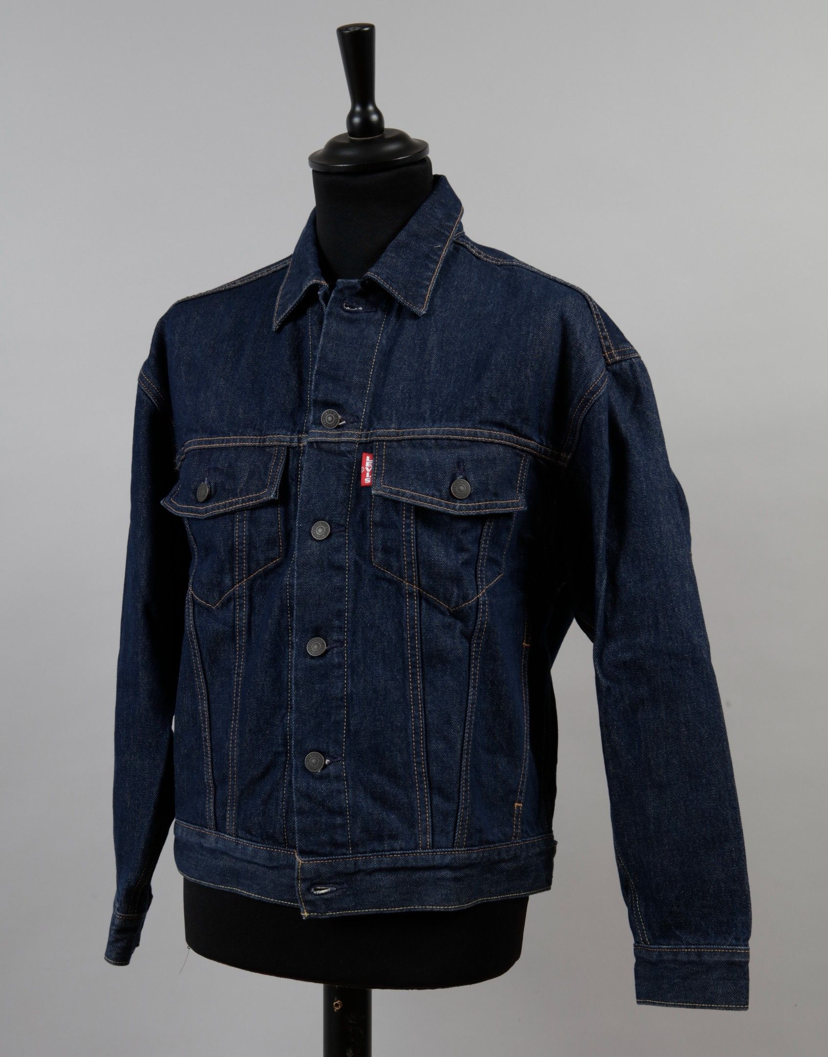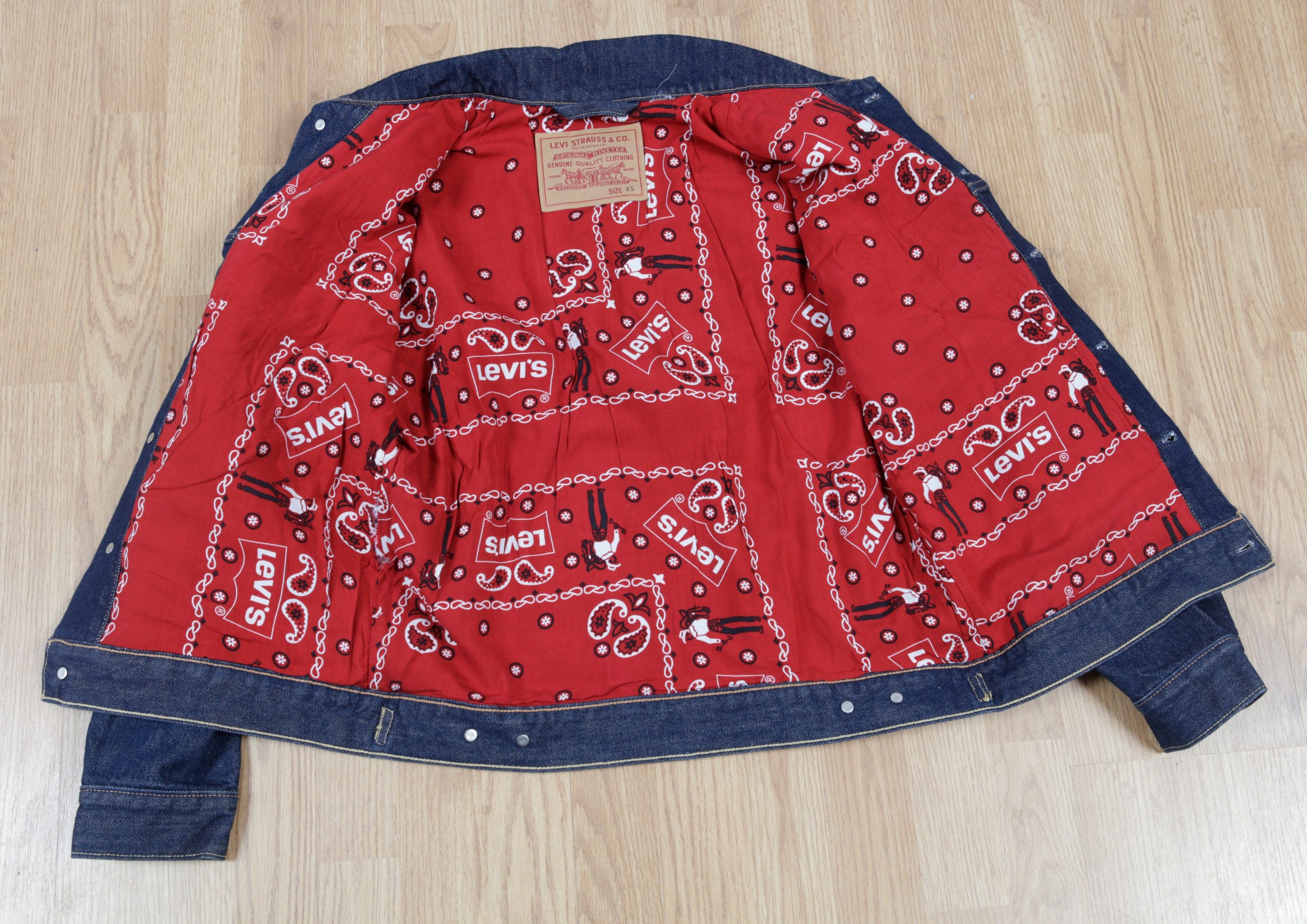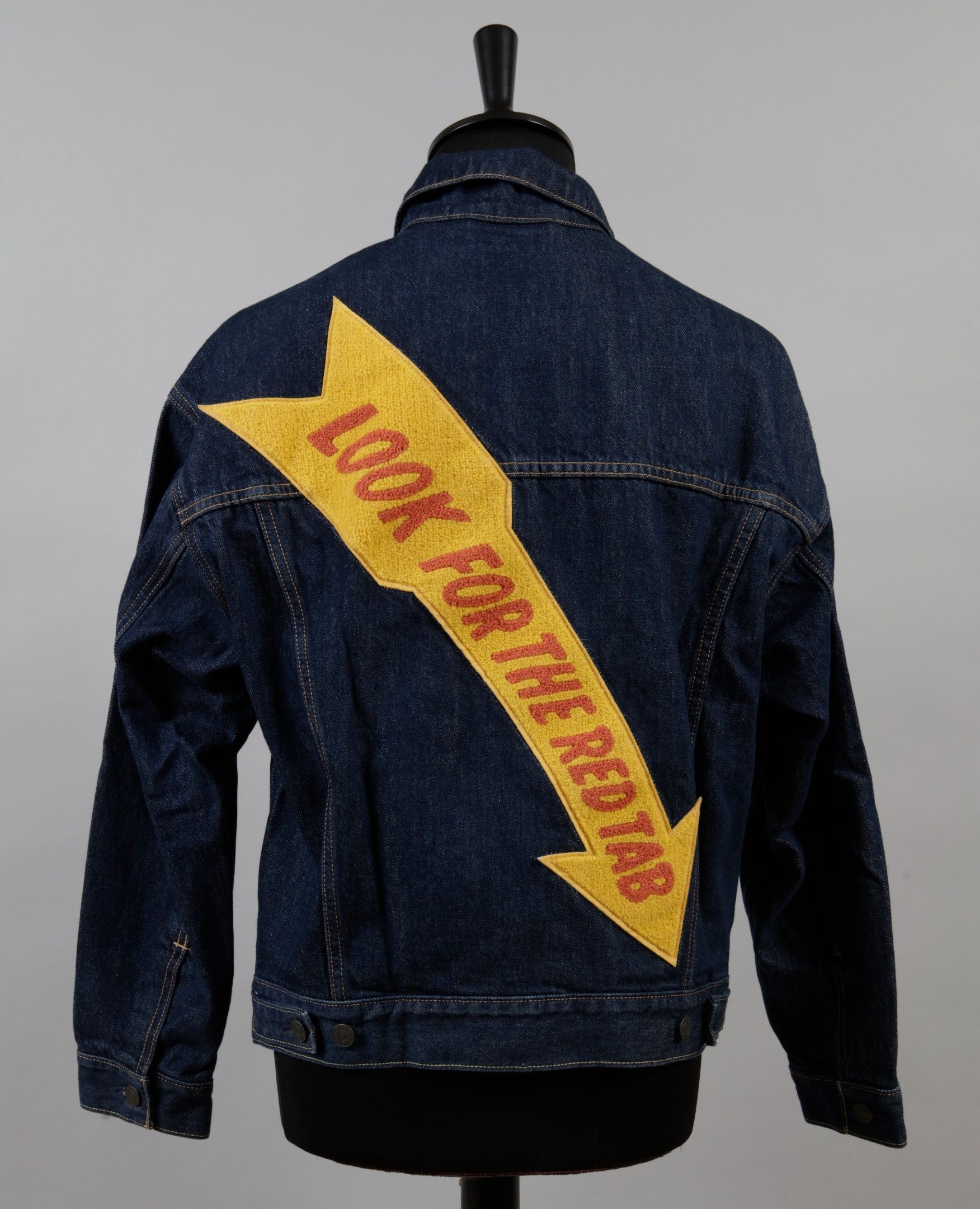 JOHNNY HALLYDAY: A very rare denim jacket, released to commemorate the 150th anniversary of the Levi's brand. This Big E collector's item - in Okura denim, dyed indigo - was given to the rocker by his friend Christian Audigier. The red lining represents the western world of the legendary brand, with its cowboys. The back is emblazoned with a large yellow arrow reading 'Look for the red tab', indicating the small red label sewn into the back of a pocket. A cult vintage piece. Johnny's personal collection.