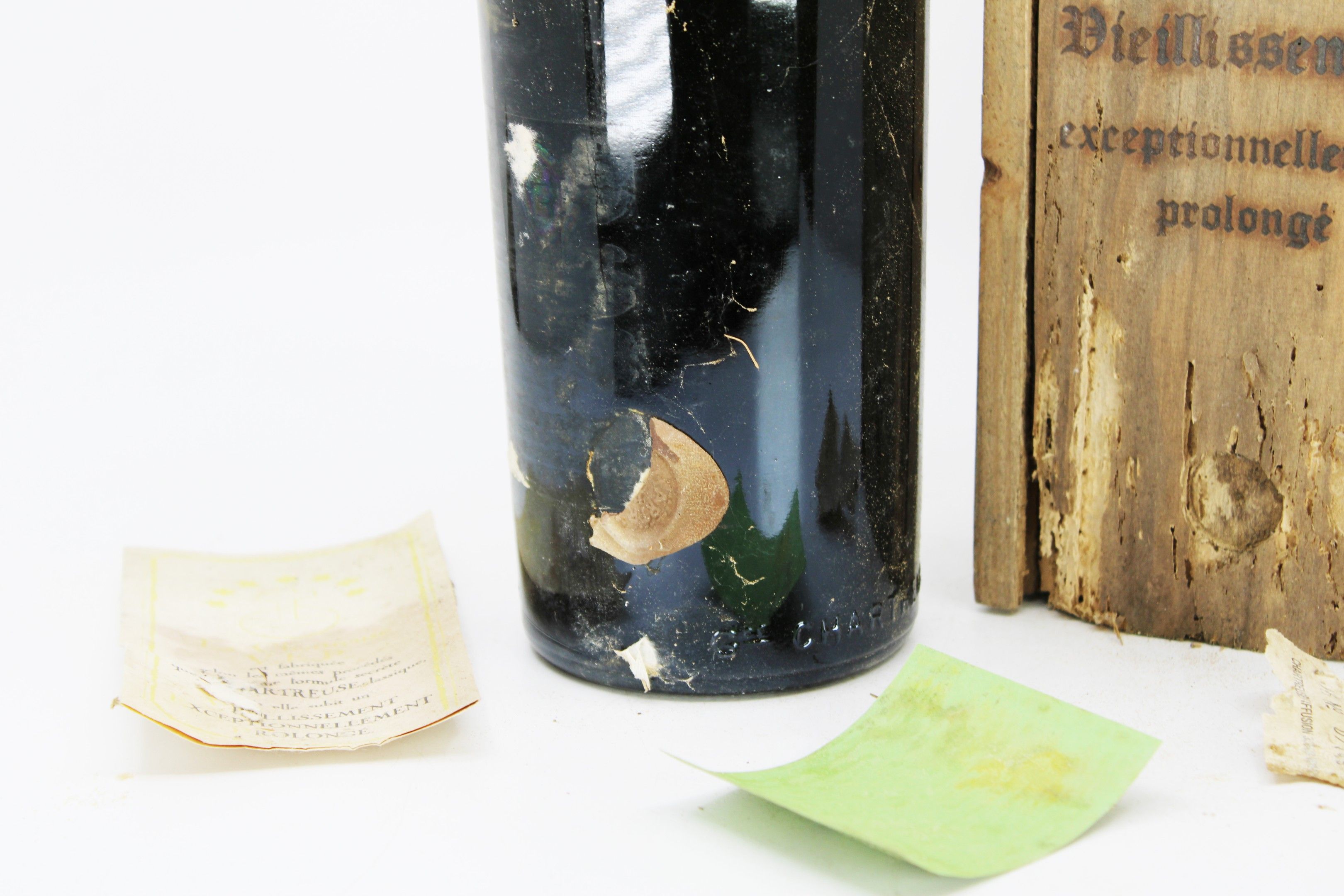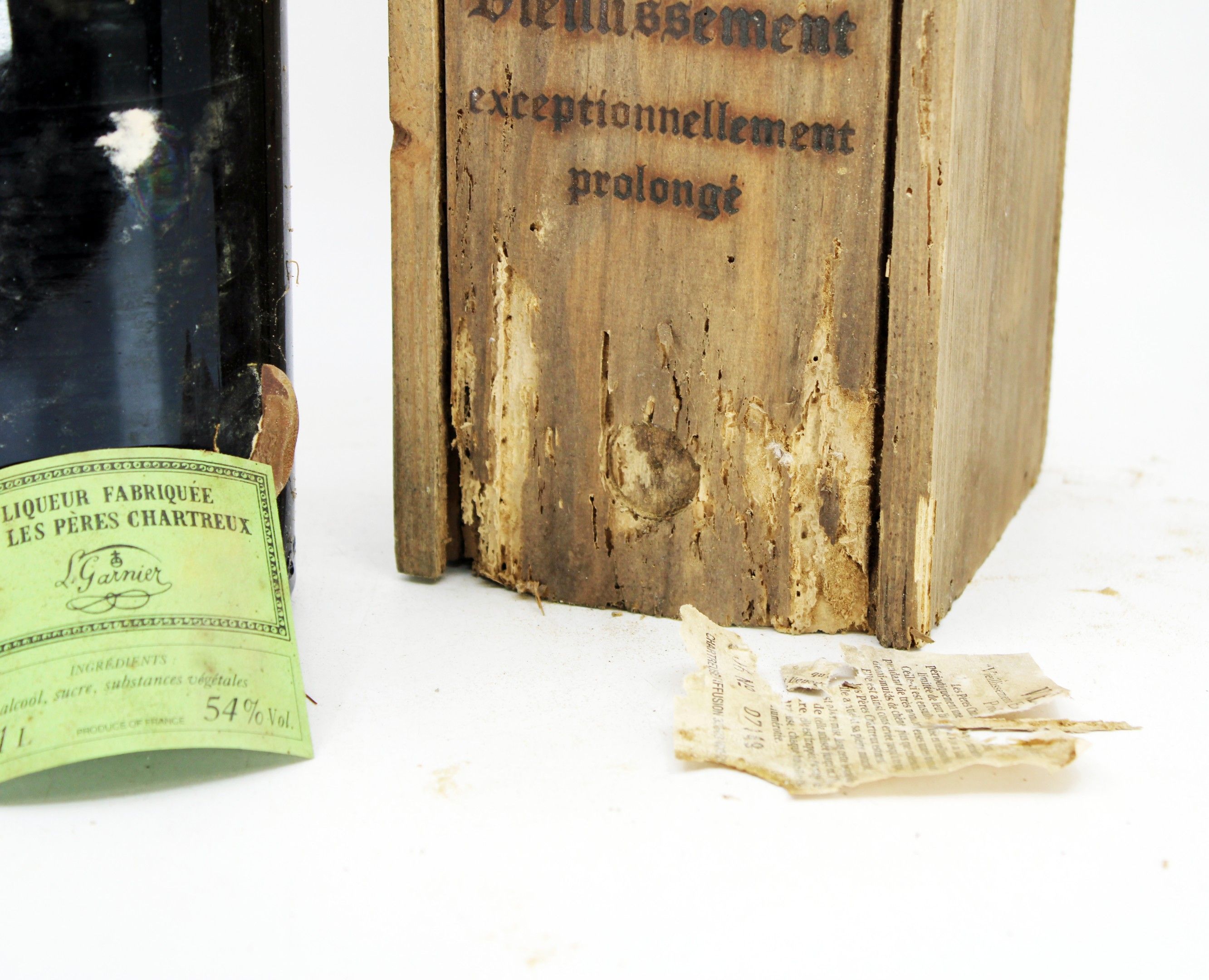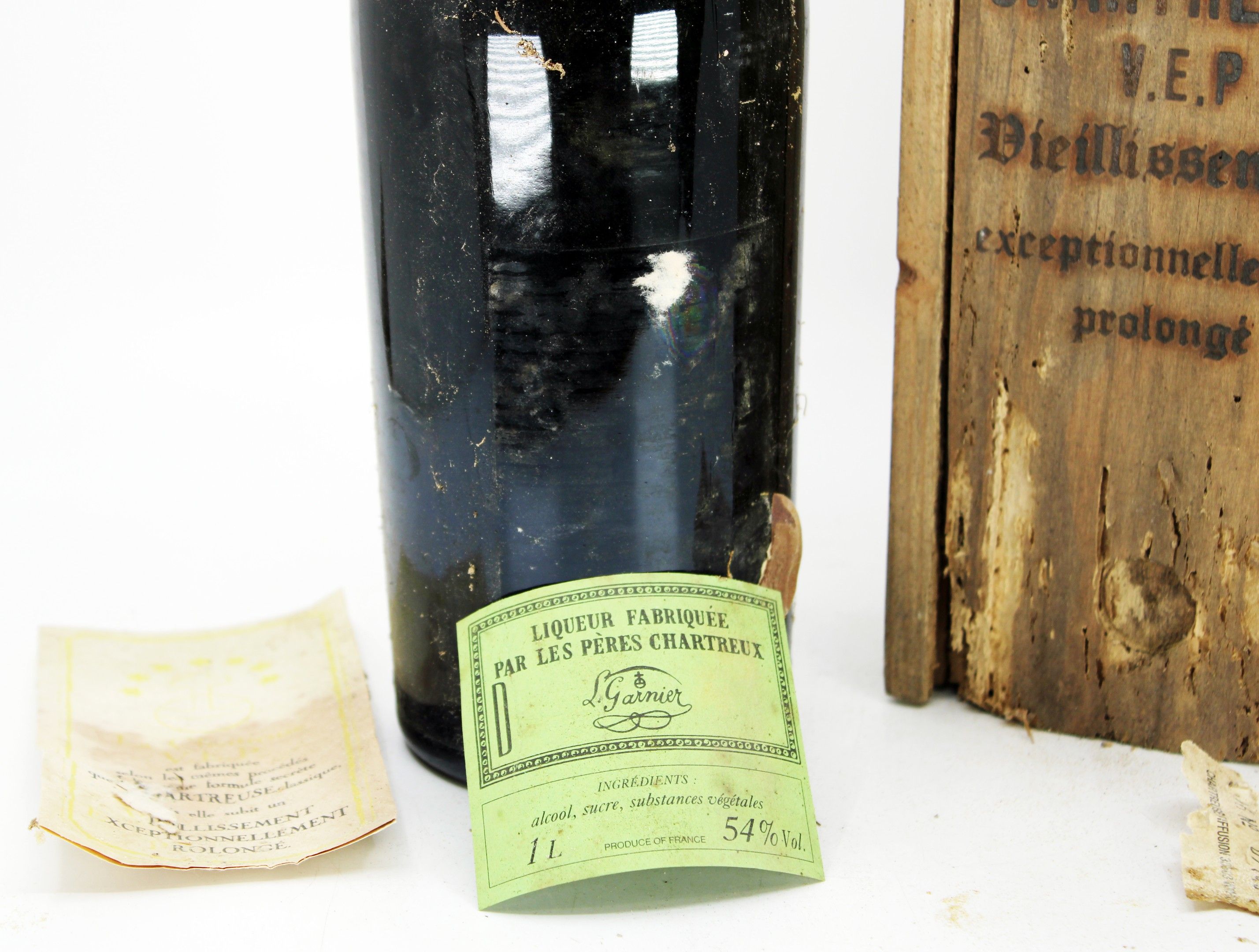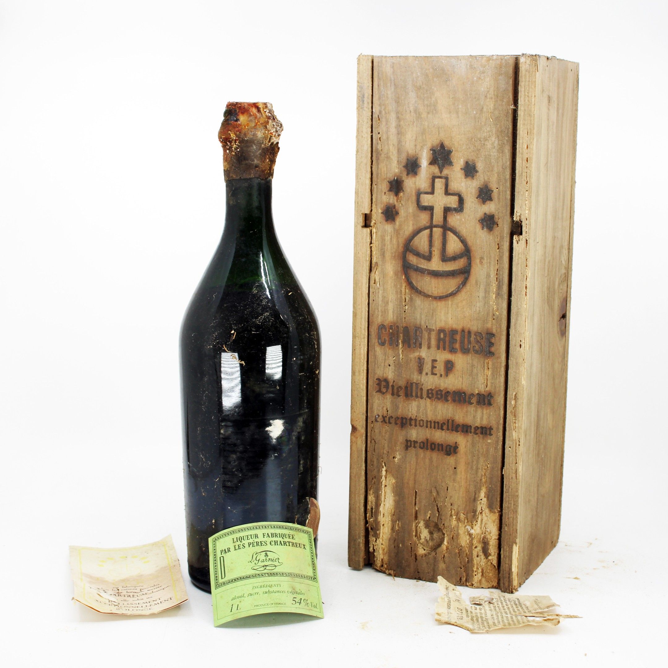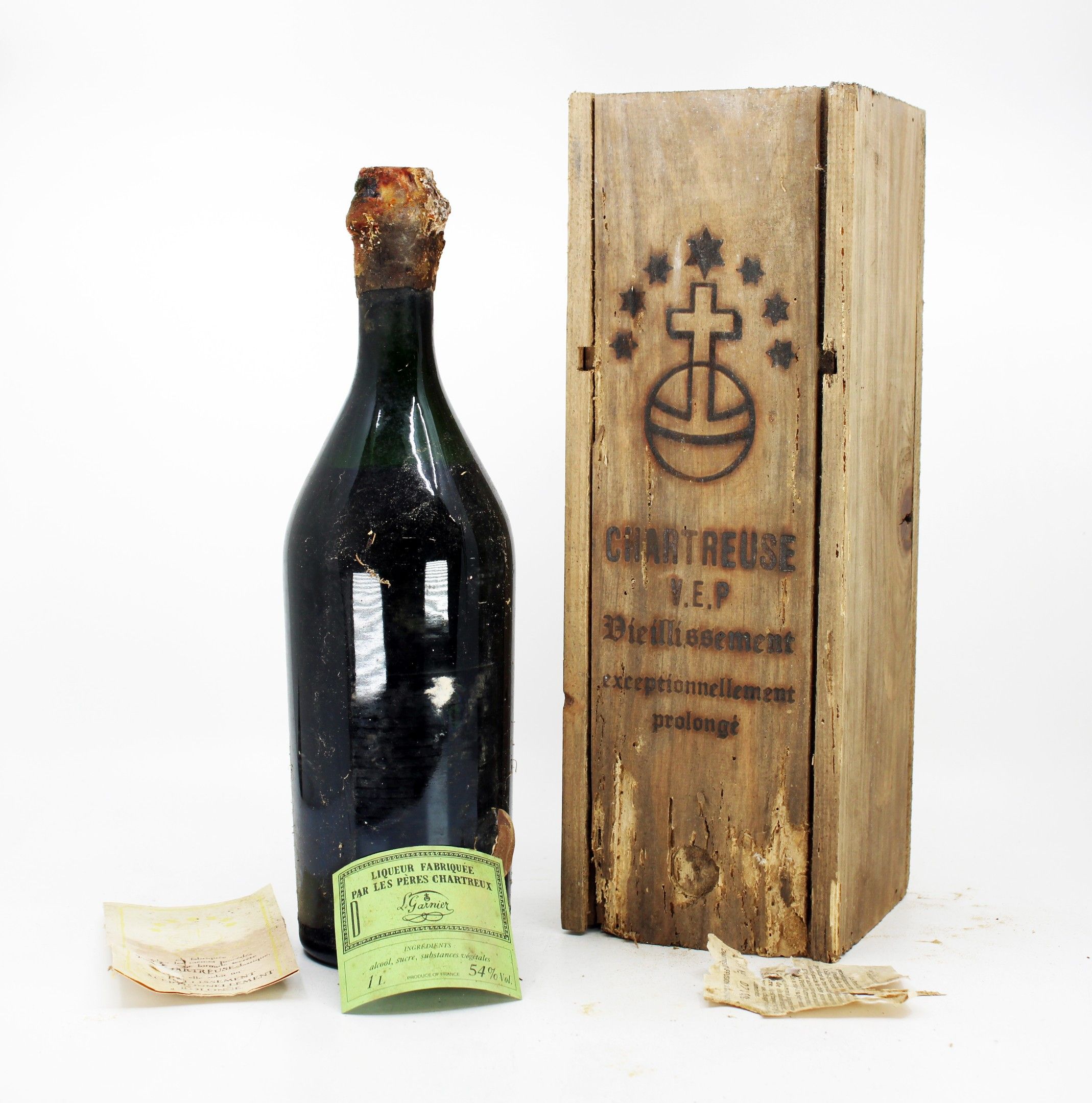 1 B CHARTREUSE VERTE VEP Set 1990 Year : NM Appellation : Pères Chartreux Alcohol content : 55 Capacity : 100 cl Packaging : Original wooden case (very damaged) Chartreuse V.E.P. Exceptionally long ageing. Observations : Wax damaged with traces of humidity. Label slightly dirty. Back label detached and damaged (present in the box). Box in poor condition. Bottle sold as is.