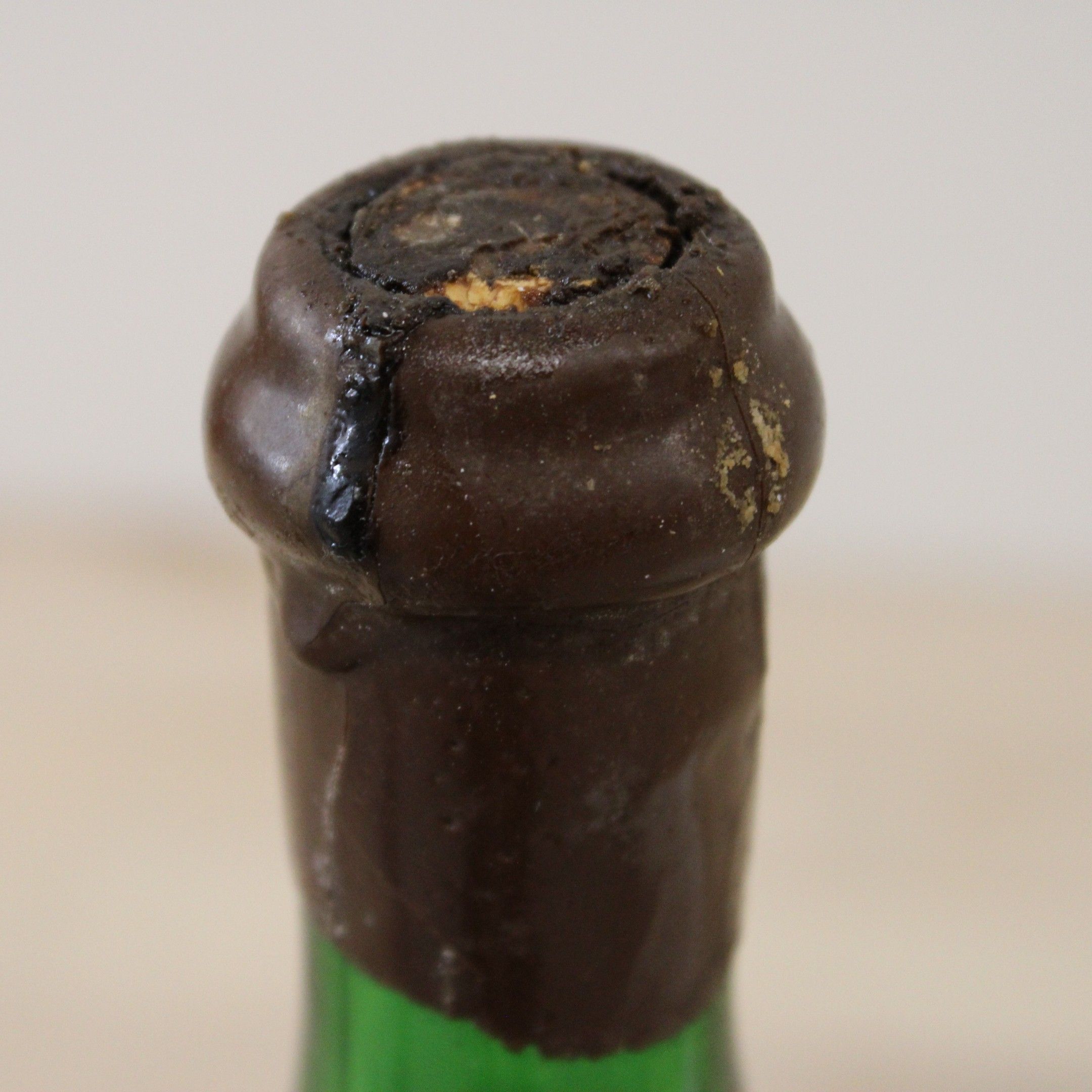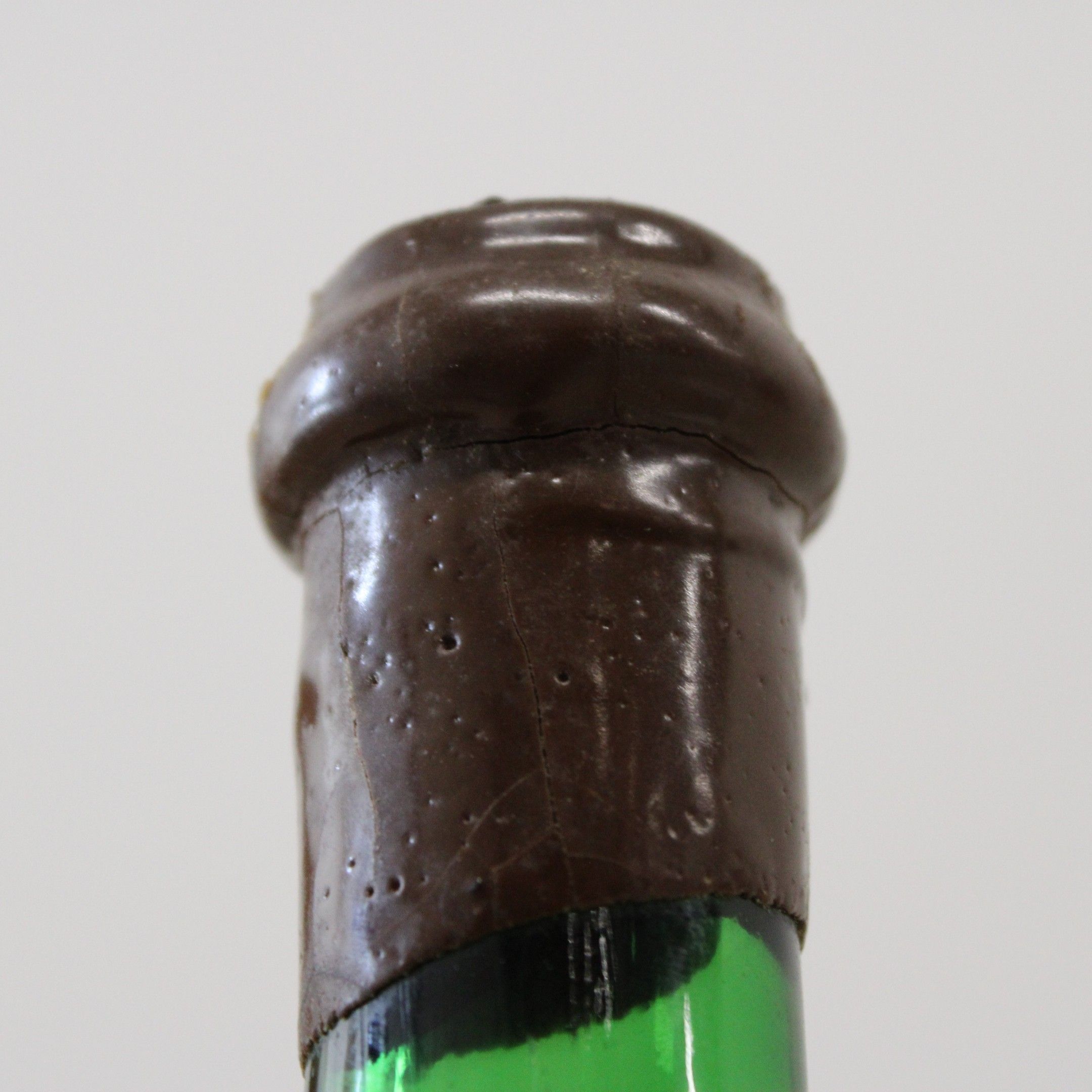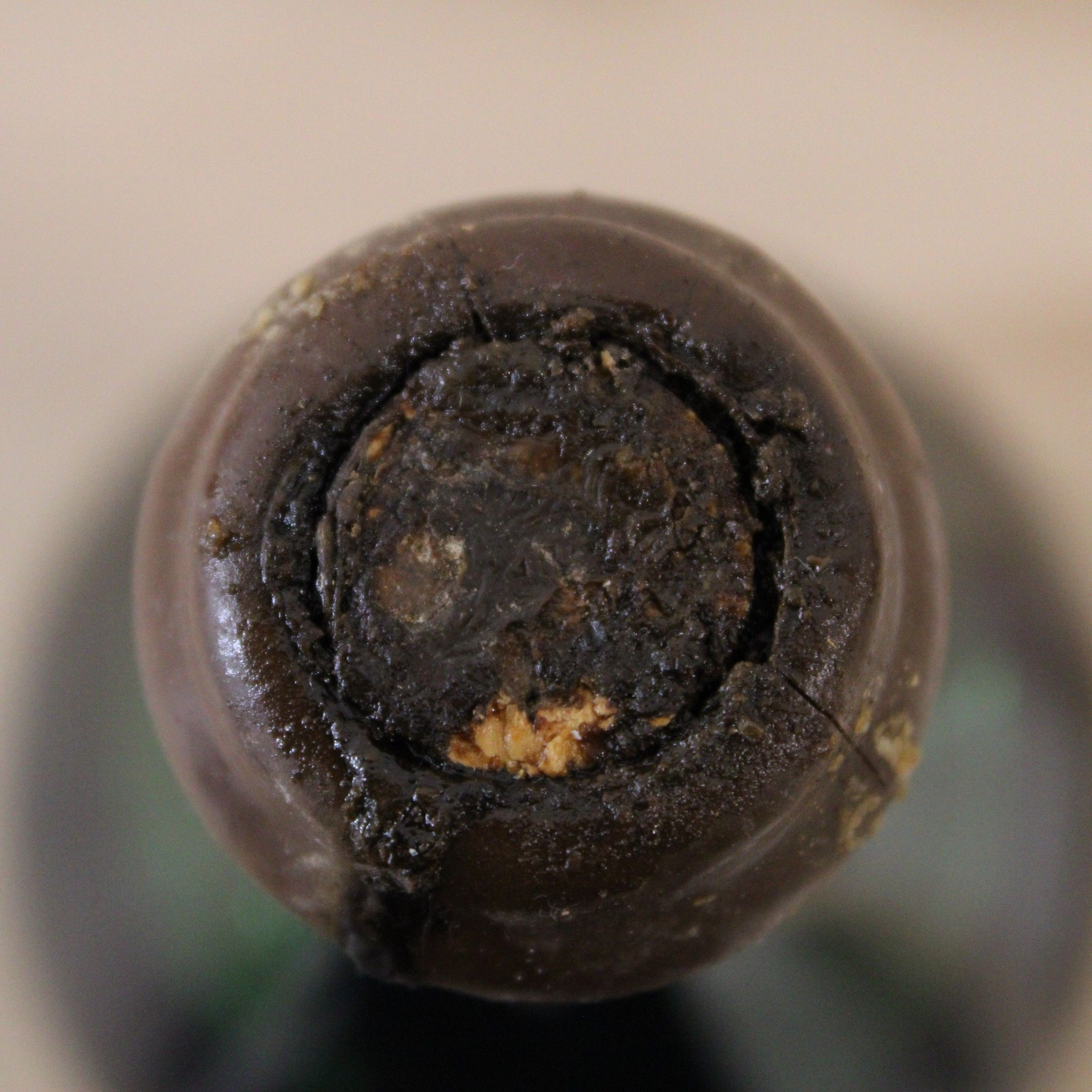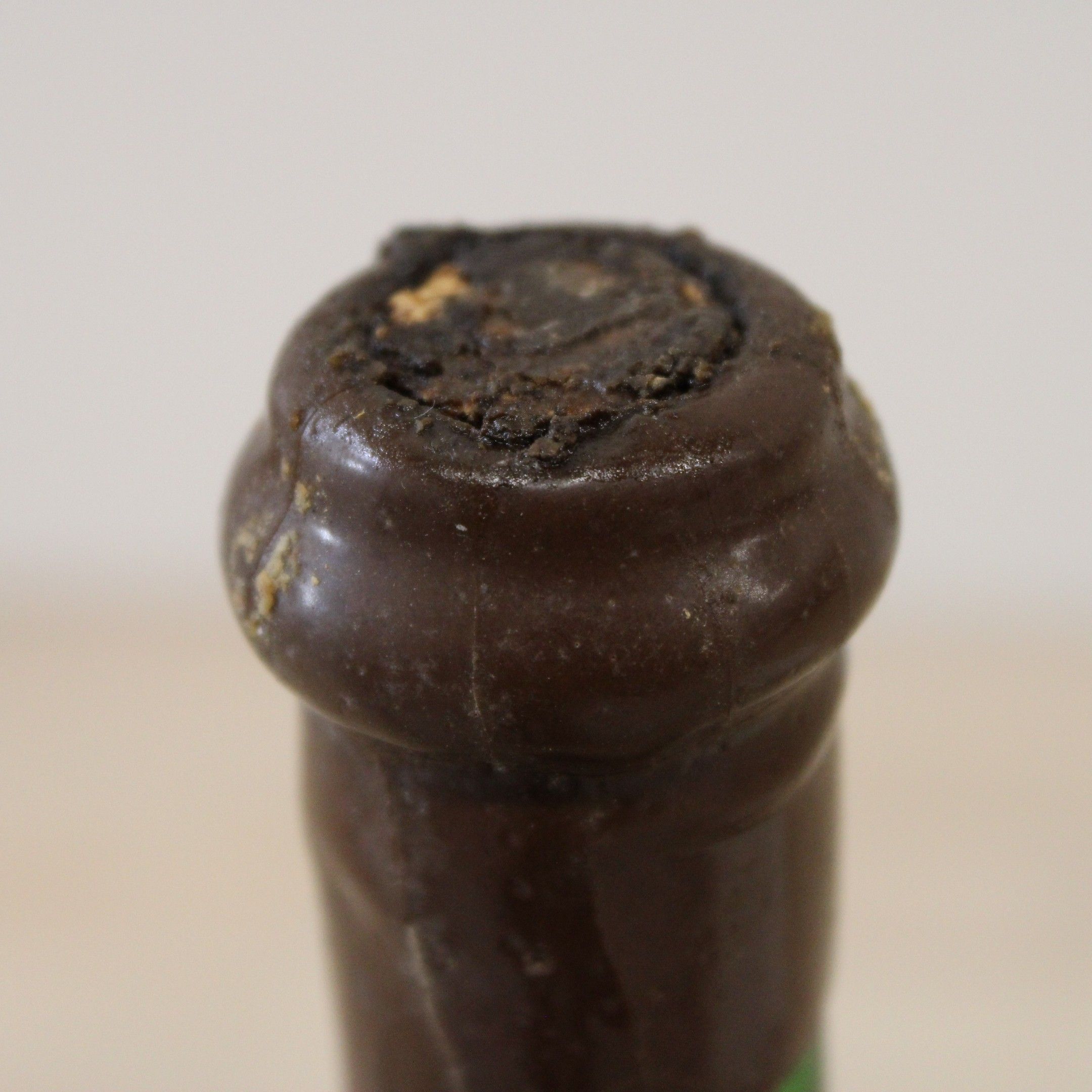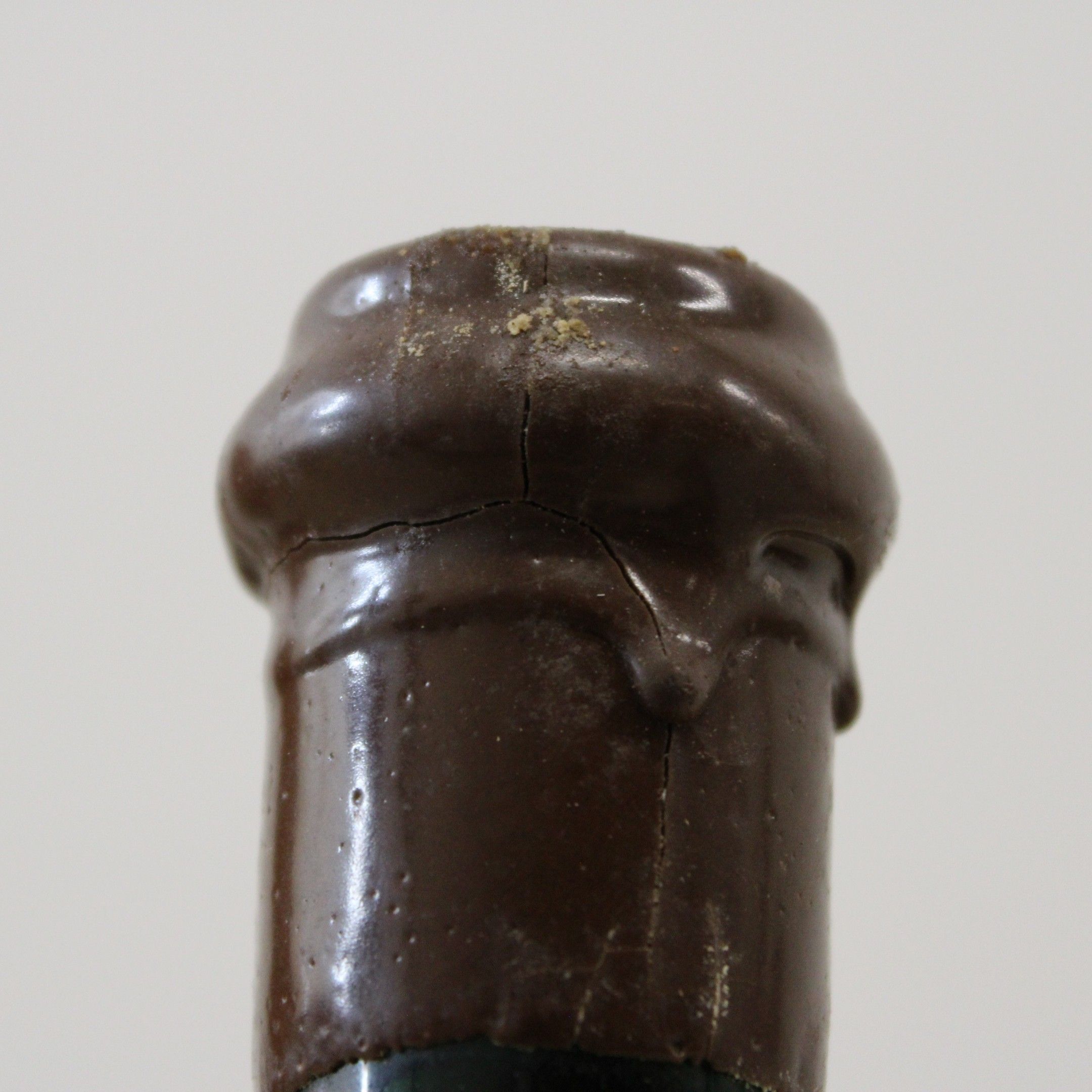 Observations: Wax missing and cork visible. Small run on the cork. Back label slightly detached and back wax damaged. Spare stopper and small document present.
