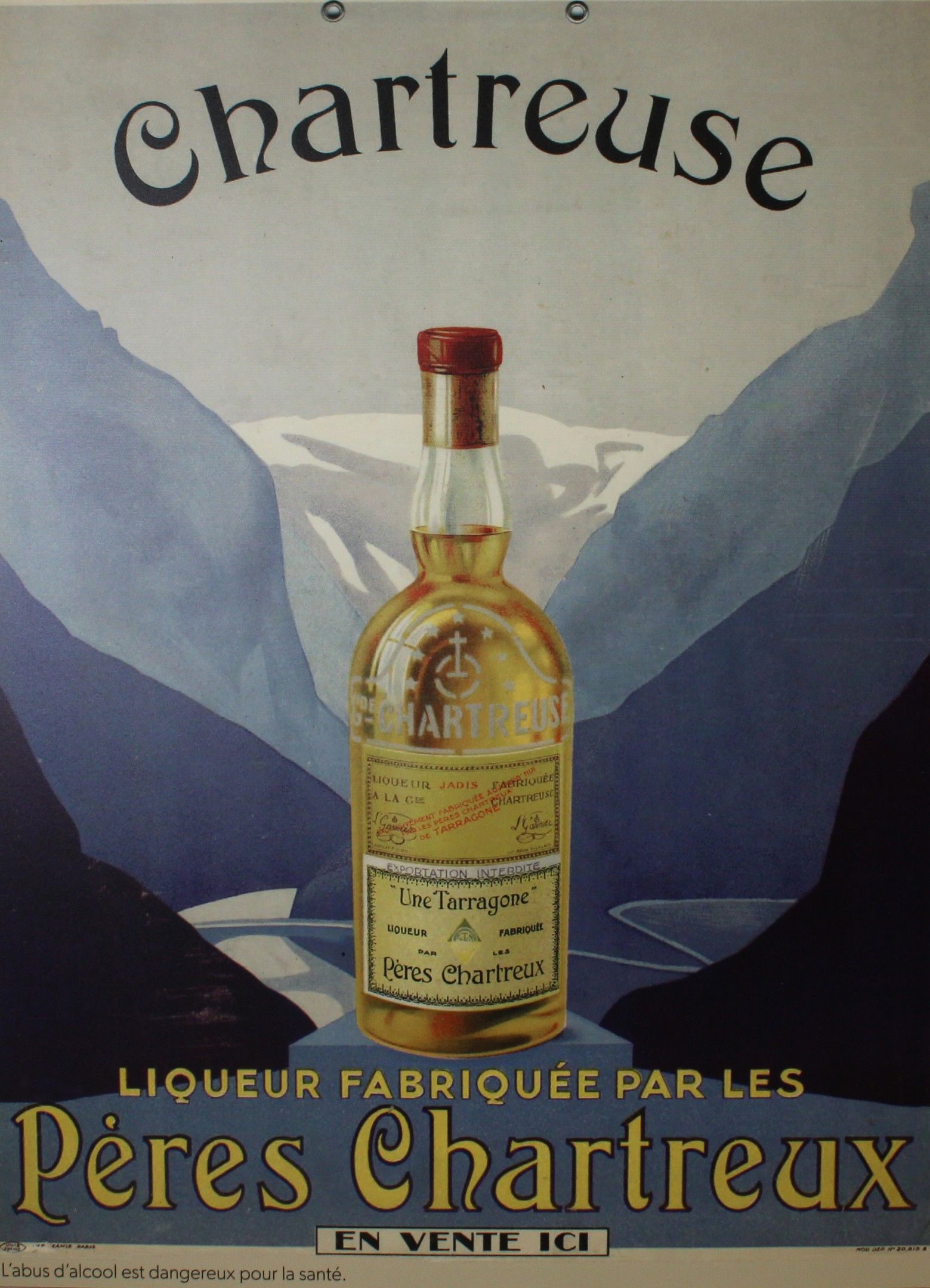 An advertisement in flexible plastic model "liqueur made by the Chartreux fathers on sale here ".