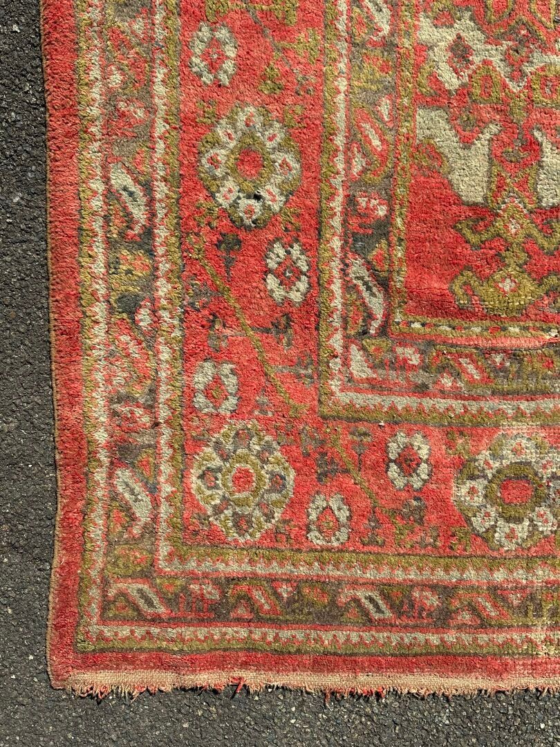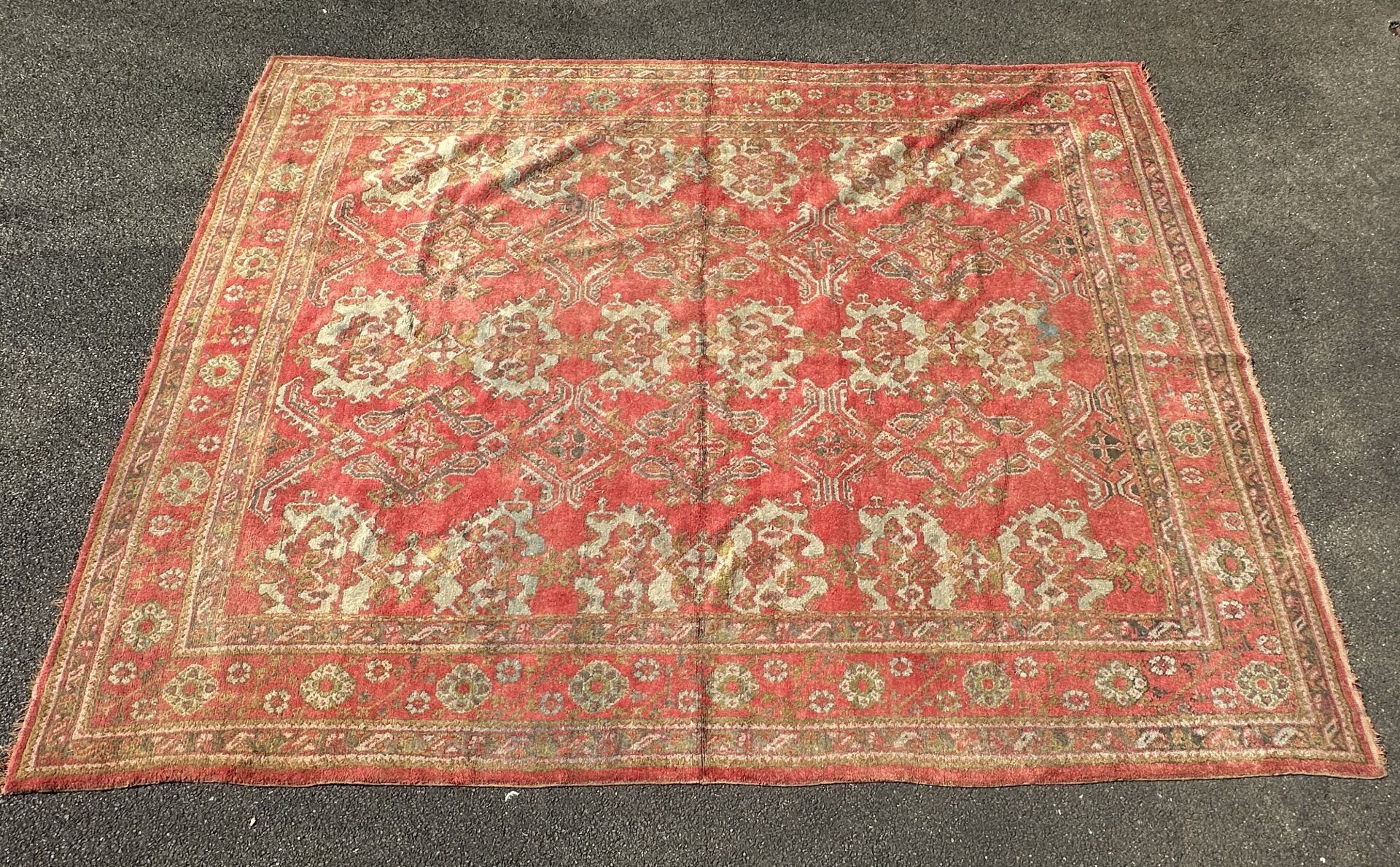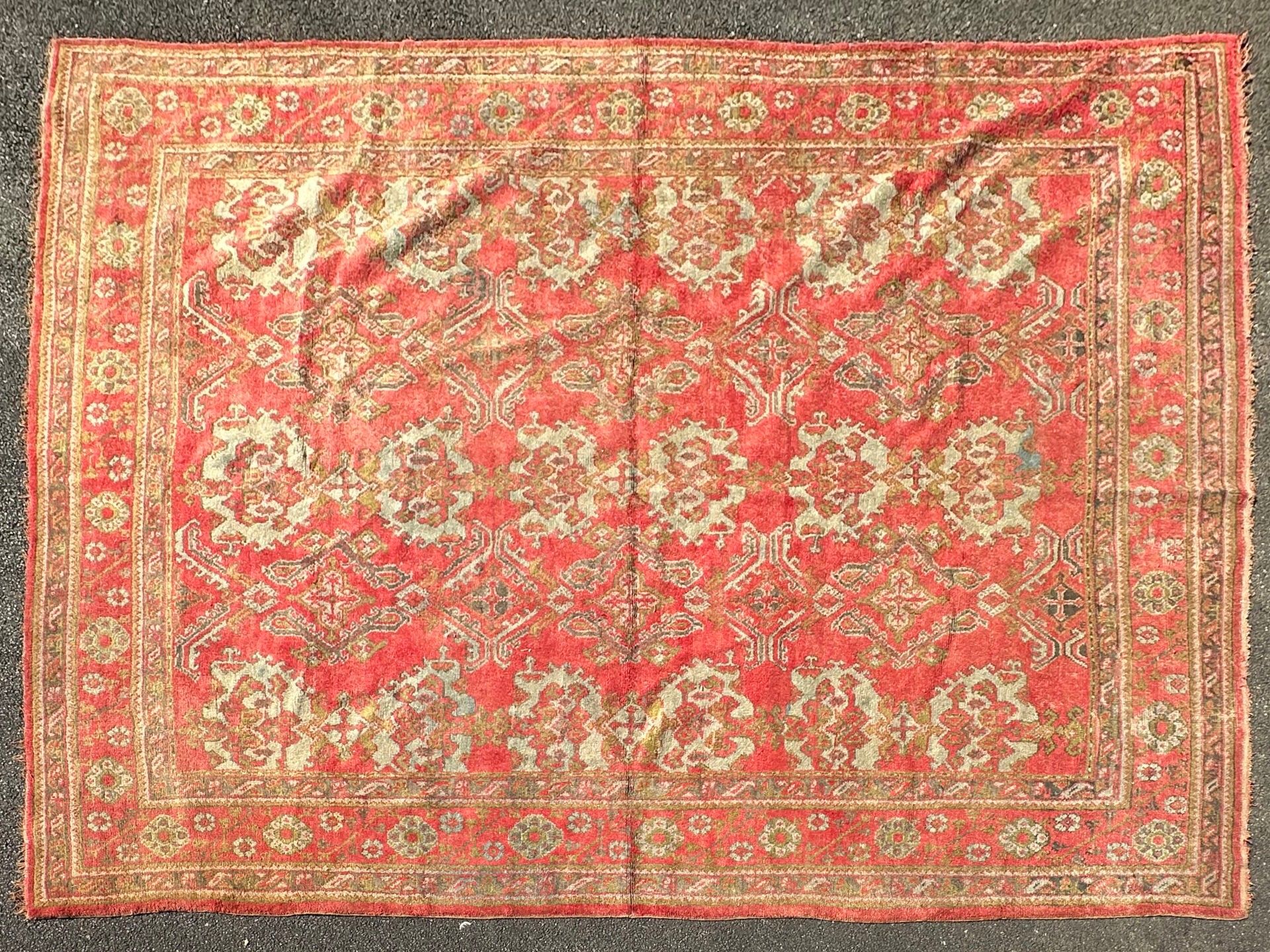 RUG, Smyrna, circa 1930, red background, turquoise decoration of rows of stylised medallions, border of flowers between braids (worn, dusted). 450 x 340 cm
