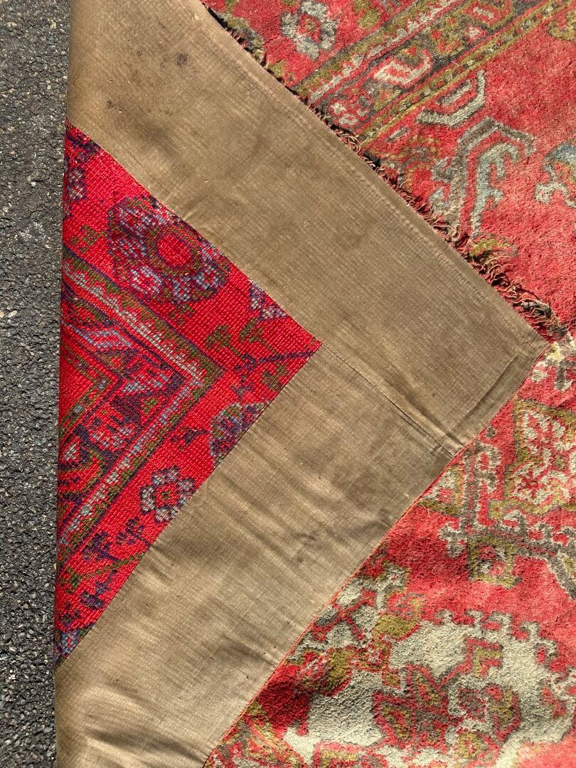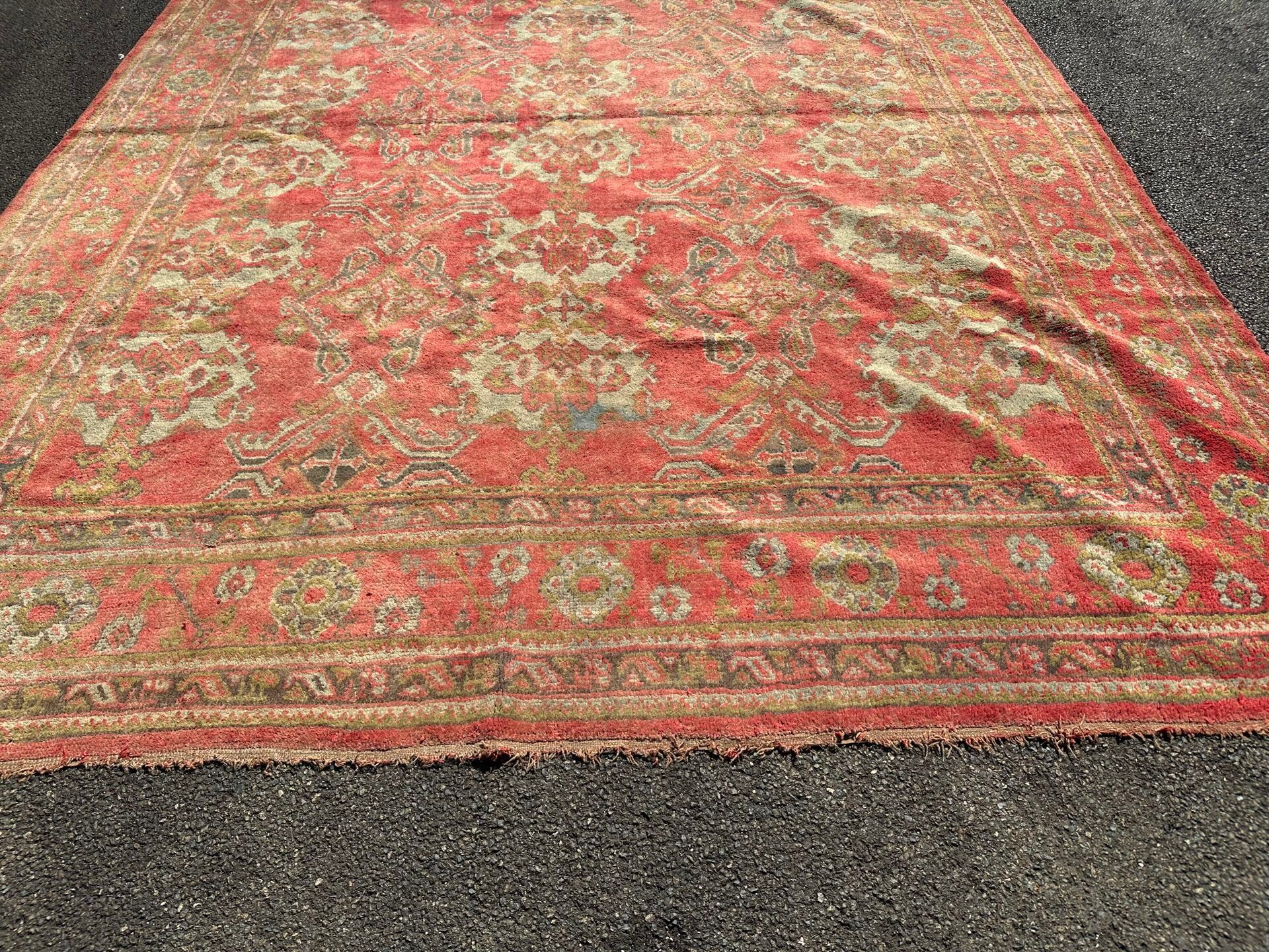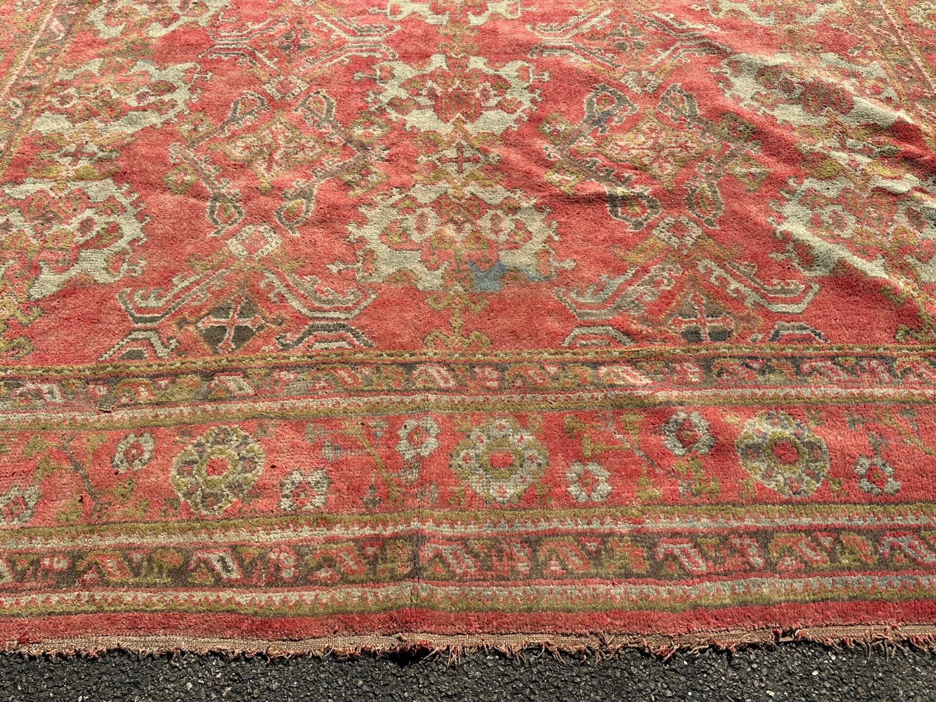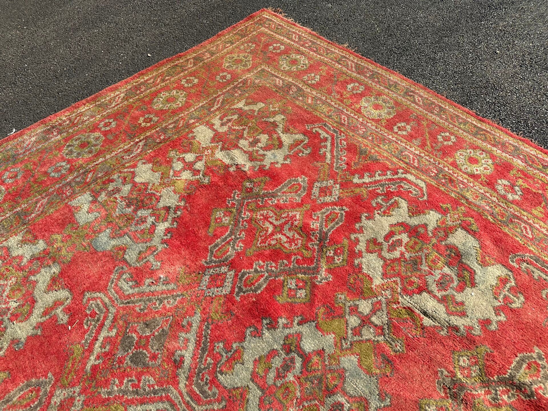 RUG, Smyrna, circa 1930, red background, turquoise decoration of rows of stylised medallions, border of flowers between braids (worn, dusted). 450 x 340 cm