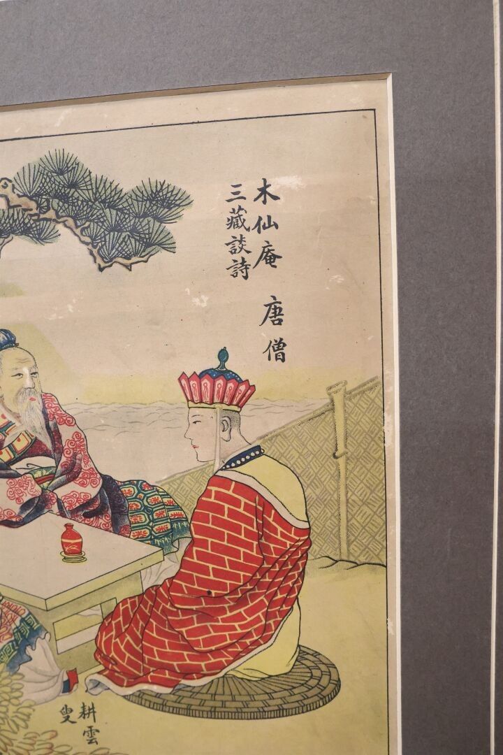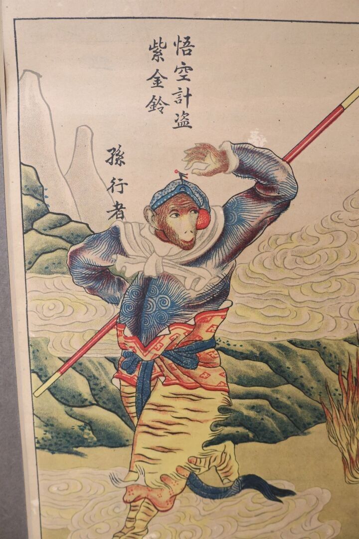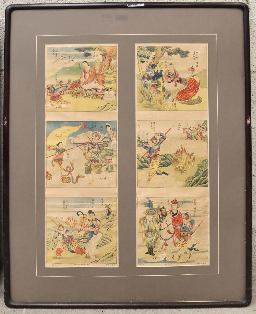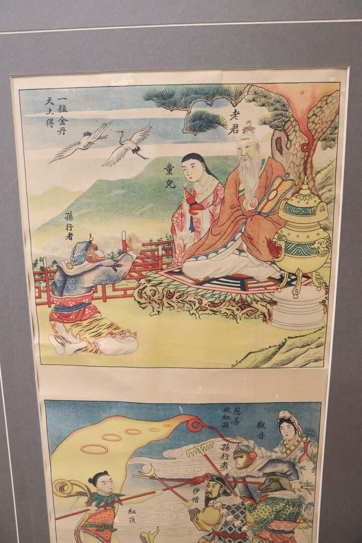 Two plates of colour reproductions of "animated scenes" 20th century China. 76 x 25 cm each in a common frame.