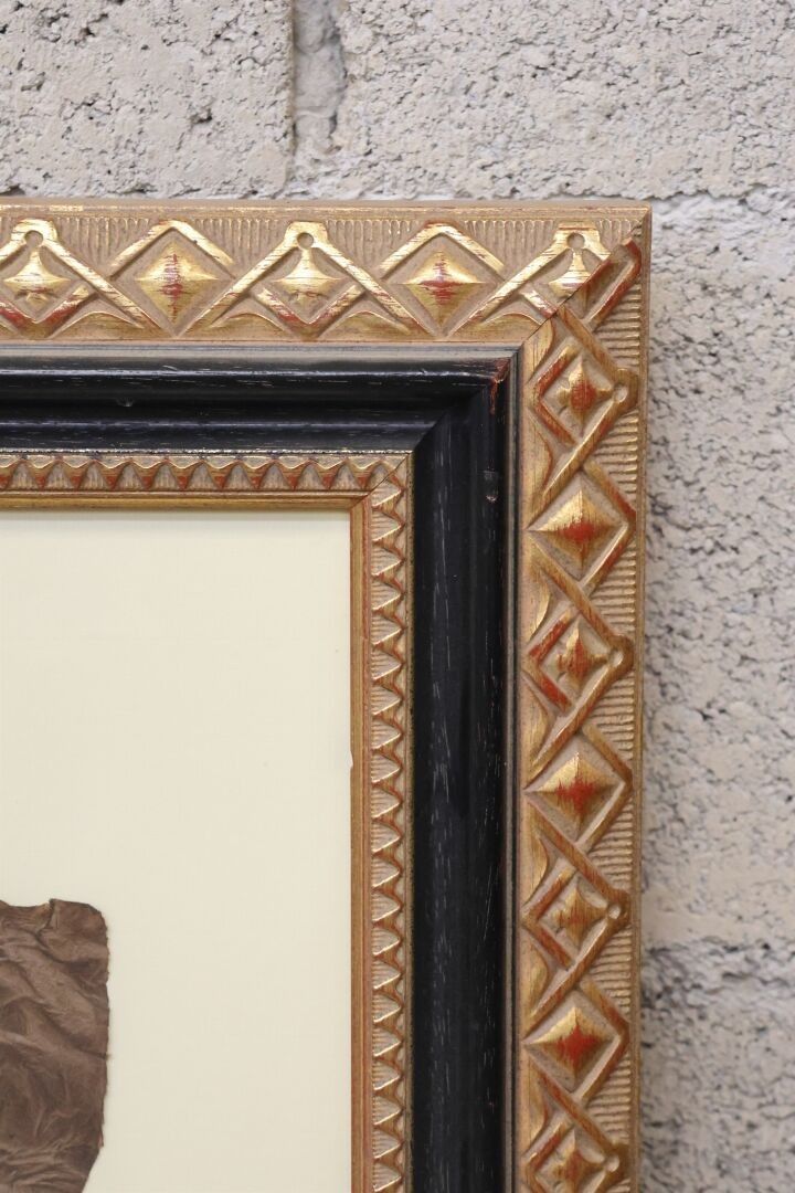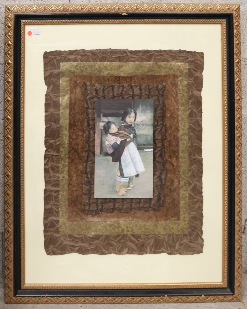 Colour reproduction of a postcard embellished with fabric and pleated paper, modern frame. Damage 100 x 80 cm (frame)